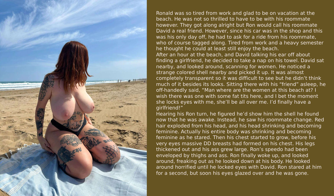 Ronald was so tired from work and glad to be on vacation at the beach. He was not so thrilled to have to be with his roommate however. They got along alright but Ron would call his roommate David a real friend. However, since his car was in the shop and this was his only day off, he had to ask for a ride from his roommate, who of course tagged along. Tired from work and a heavy semester he thought he could at least still enjoy the beach. After an hour at the beach, and David talking his ear off about finding a girlfriend, he decided to take a nap on his towel. David sat nearby, and looked around, scanning for women. He noticed a strange colored shell nearby and picked it up. It was almost completely transparent so it was difficult to see but he didn’t think much of it besides its looks. Sitting there with his “friend” asleep, he off-handedly said, “Man where are the women at this beach at? I wish there was one with some fat tits here, and I bet the moment she locks eyes with me, she’ll be all over me. I’d finally have a girlfriend!” Hearing his Ron turn, he figured he’d show him the shell he found now that he was awake. Instead, he saw his roommate change. Red hair exploded from his head, and his head shrinking and becoming feminine. Actually his entire body was shrinking and becoming feminine as he stared. Then his chest started to grow, before his very eyes massive DD breasts had formed on his chest. His legs thickened out and his ass grew large. Ron’s speedo had been enveloped by thighs and ass. Ron finally woke up, and looked around, freaking out as he looked down at his body. He looked around horrified until he locked eyes with David. Ron stared at him for a second, but soon his eyes glazed over and he was gone.