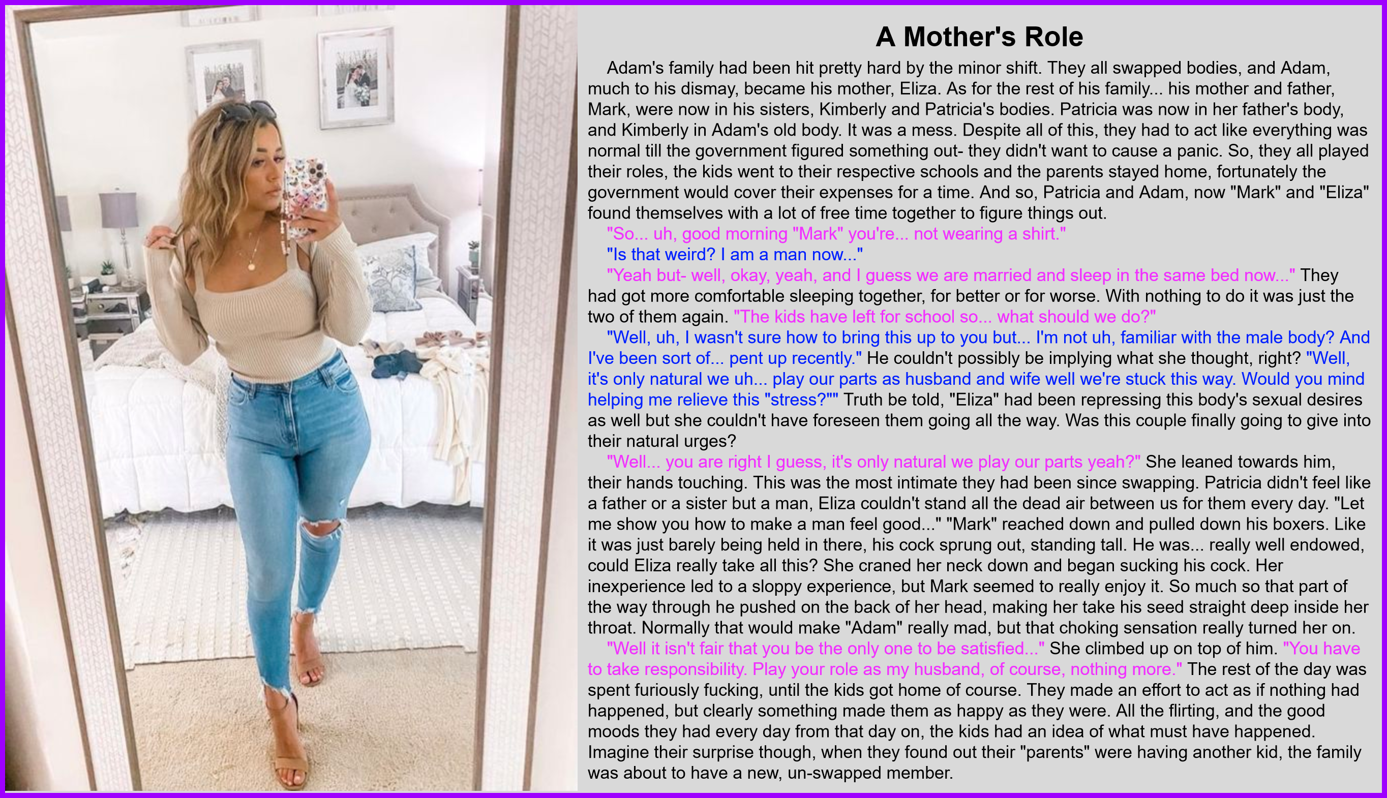 "Well… you are right I guess, it's only natural we play our parts yeah?" She leaned towards him, their hands touching. This was the most intimate they had been since swapping. Patricia didn't feel like a father or a sister but a man, Eliza couldn't stand all the dead air between us for them every day. "Let me show you how to make a man feel good…" "Mark" reached down and pulled down his boxers. Like it was just barely being held in there, his cock sprung out, standing tall. He was… really well endowed, could Eliza really take all this? She craned her neck down and began sucking his cock. Her inexperience led to a sloppy experience, but Mark seemed to really enjoy it. So much so that part of the way through he pushed on the back of her head, making her take his seed straight deep inside her throat. Normally that would make "Adam" really mad, but that choking sensation really turned her on.