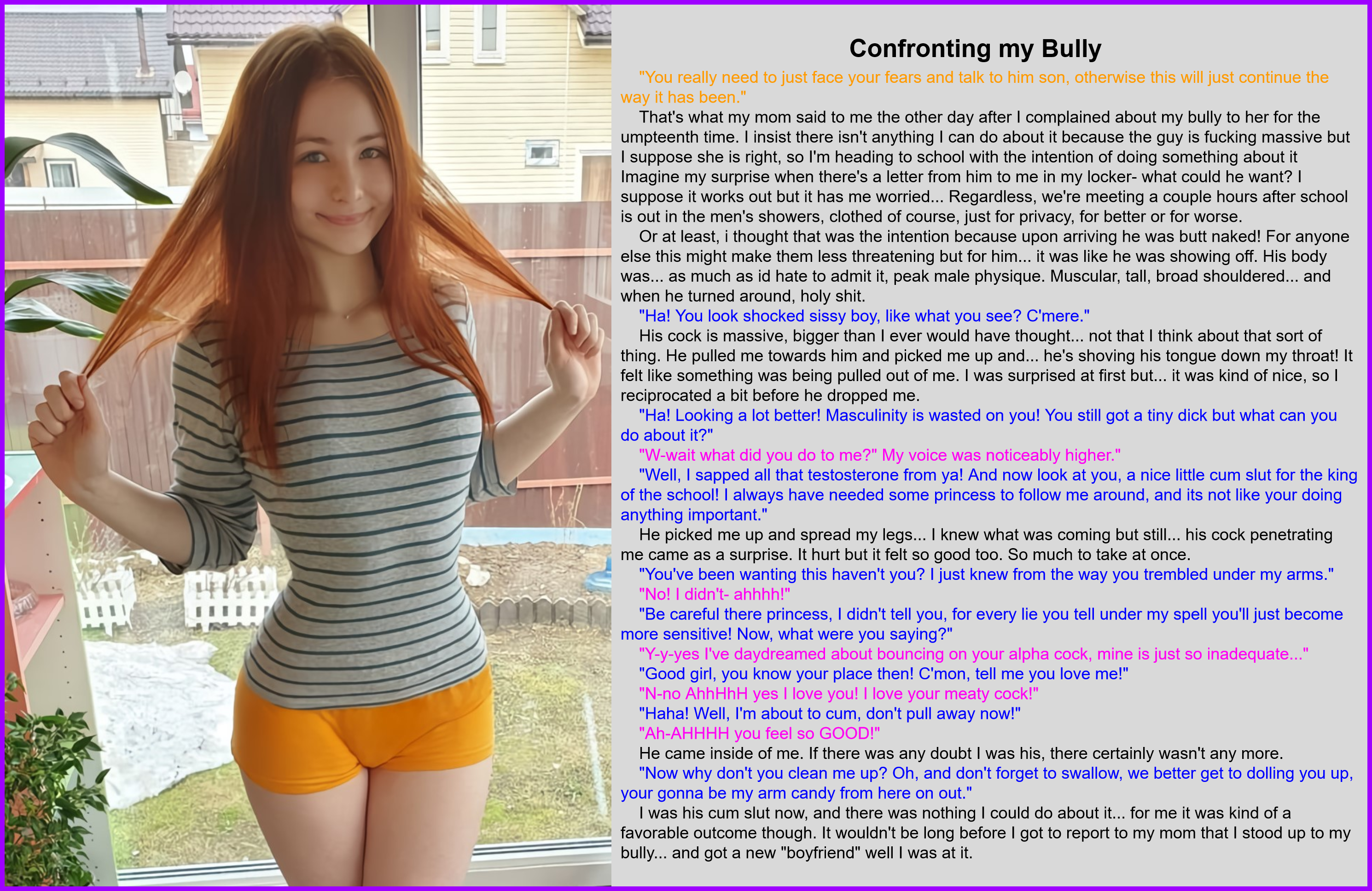 "Well, i sapped all that testosterone from ya! And now look at you, a nice little cum slut for the king of the school! I always have needed some princess to follow me around, and its not like your doing anything important."