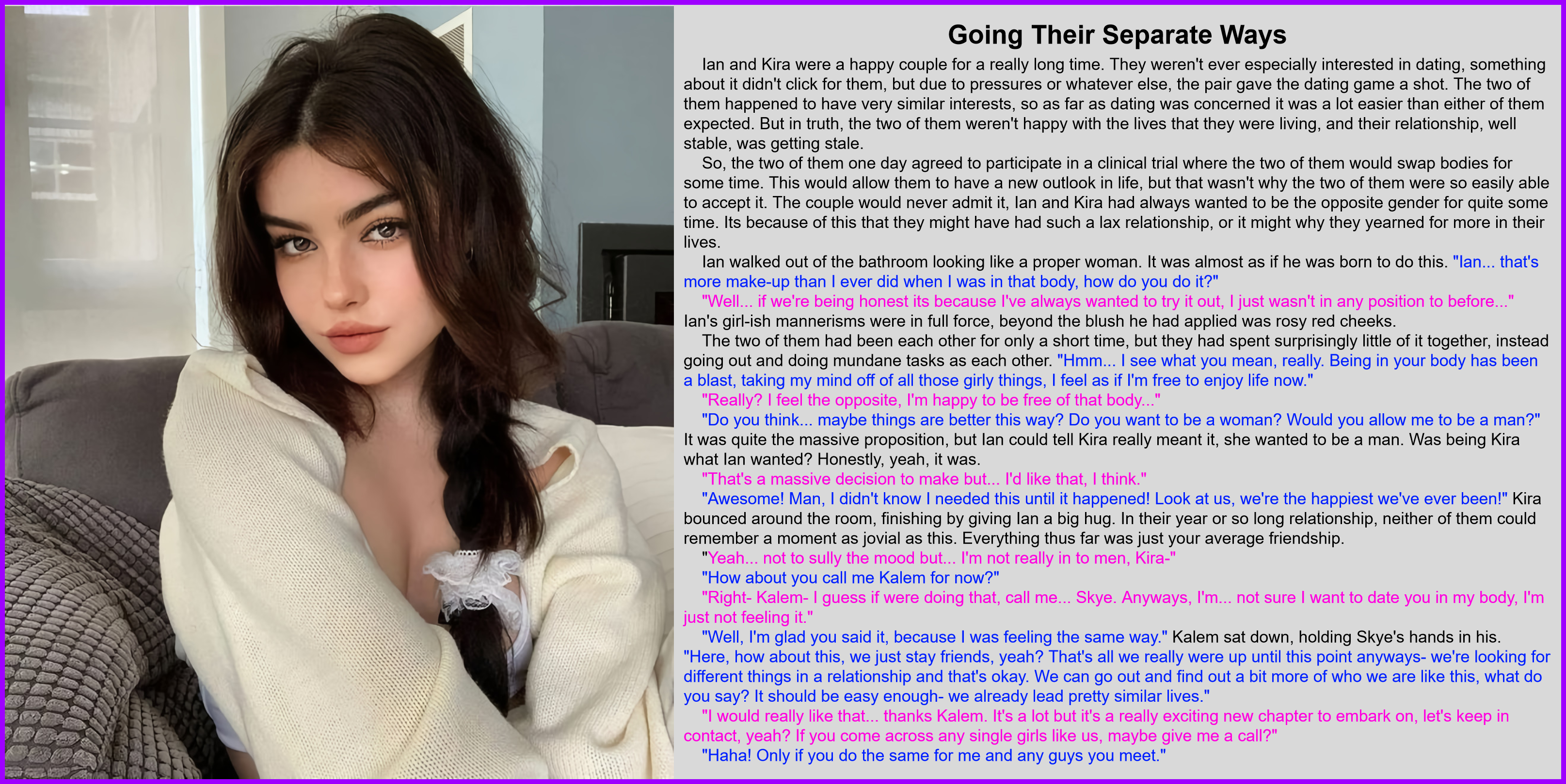 So, the two of them one day agreed to participate in a clinical trial where the two of them would swap bodies for some time. This would allow them to have a new outlook in life, but that wasn't why the two of them were so easily able to accept it. The couple would never admit it, Ian and Kira had always wanted to be the opposite gender for quite some time. Its because of this that they might have had such a lax relationship, or it might why they yearned for more in their lives.