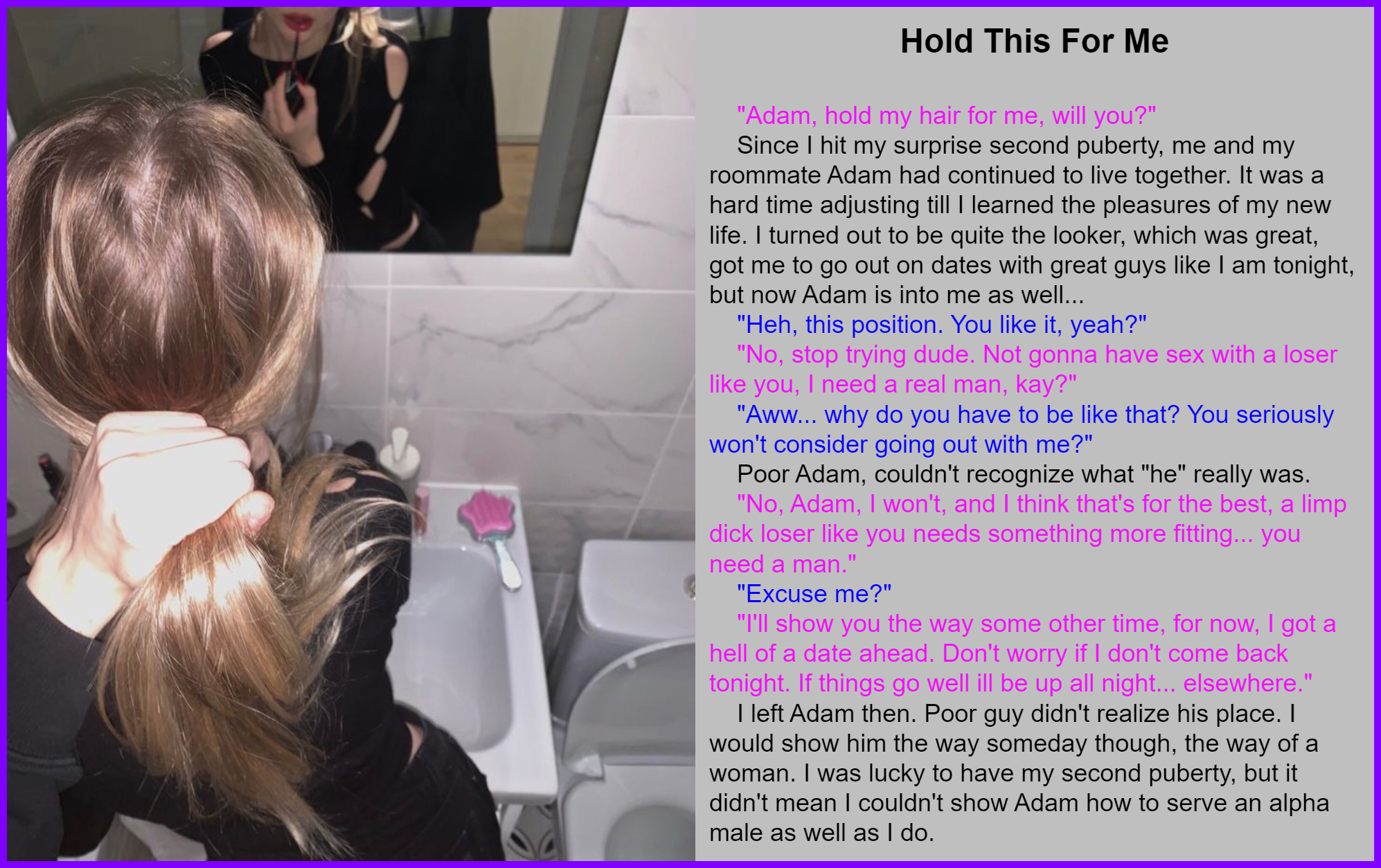 I left Adam then. Poor guy didn't realize his place. I would show him the way someday though, the way of a woman. I was lucky to have my second puberty, but it didn't mean I couldn't show Adam how to serve an alpha male as well as I do.