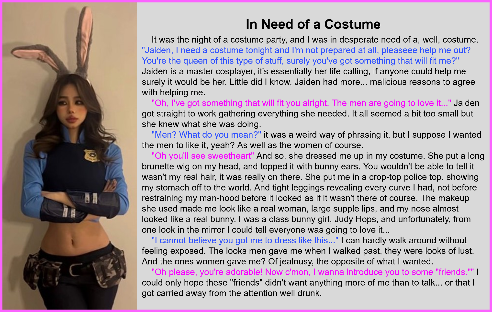 "Oh you'll see sweetheart" And so, she dressed me up in my costume. She put a long brunette wig on my head, and topped it with bunny ears. You wouldn't be able to tell it wasn't my real hair, it was really on there. She put me in a crop-top police top, showing my stomach off to the world. And tight leggings revealing every curve I had, not before restraining my man-hood before it looked as if it wasn't there of course. The makeup she used made me look like a real woman, large supple lips, and my nose almost looked like a real bunny. I was a class bunny girl, Judy Hops, and unfortunately, from one look in the mirror I could tell, everyone was going to love it…