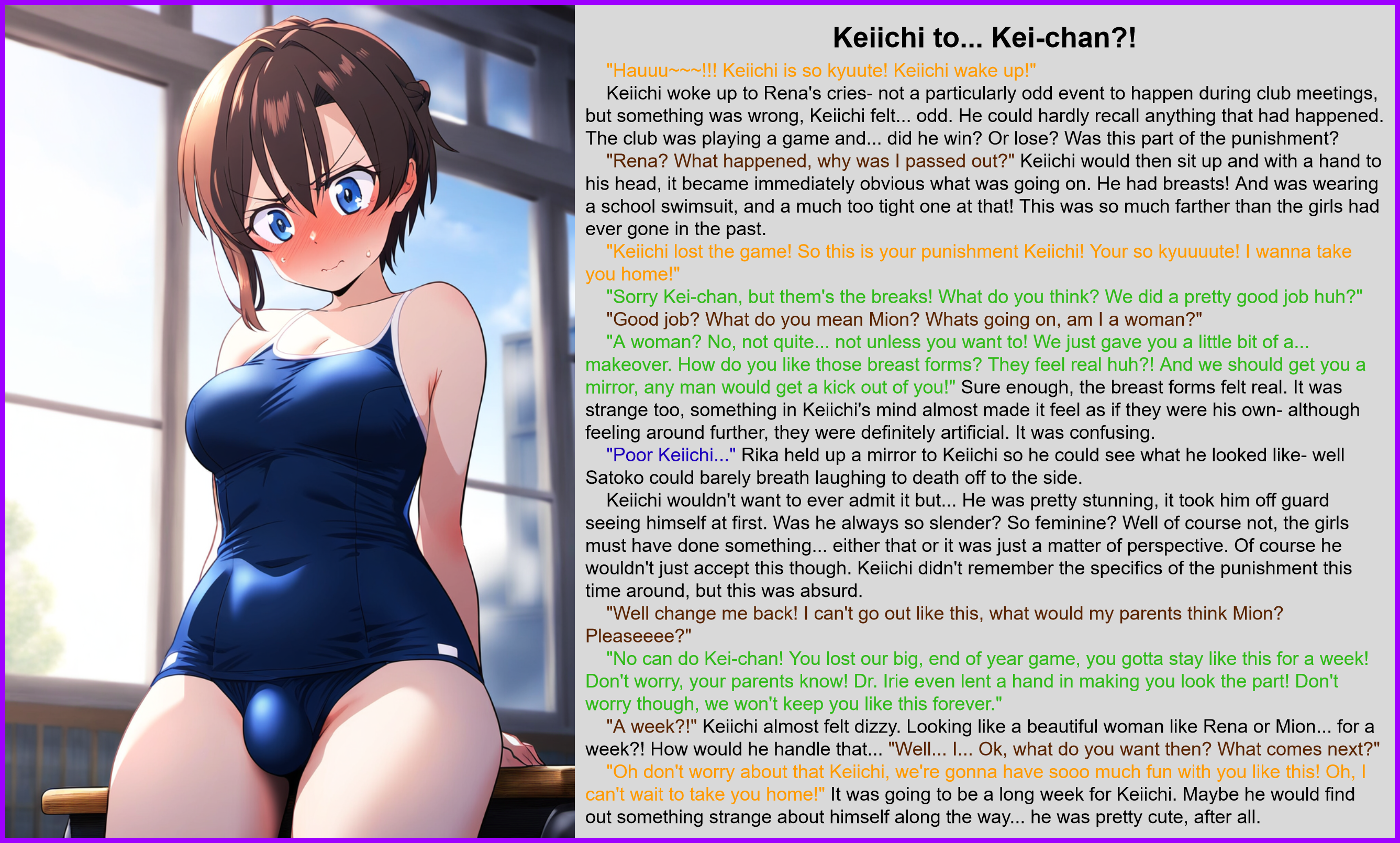 "Rena? What happened, why was I passed out?" Keiichi would then sit up and with a hand to his head, it became immediately obvious what was going on. He had breasts! And was wearing a school swimsuit, and a much too tight one at that! This was so much farther than the girls had ever gone in the past.