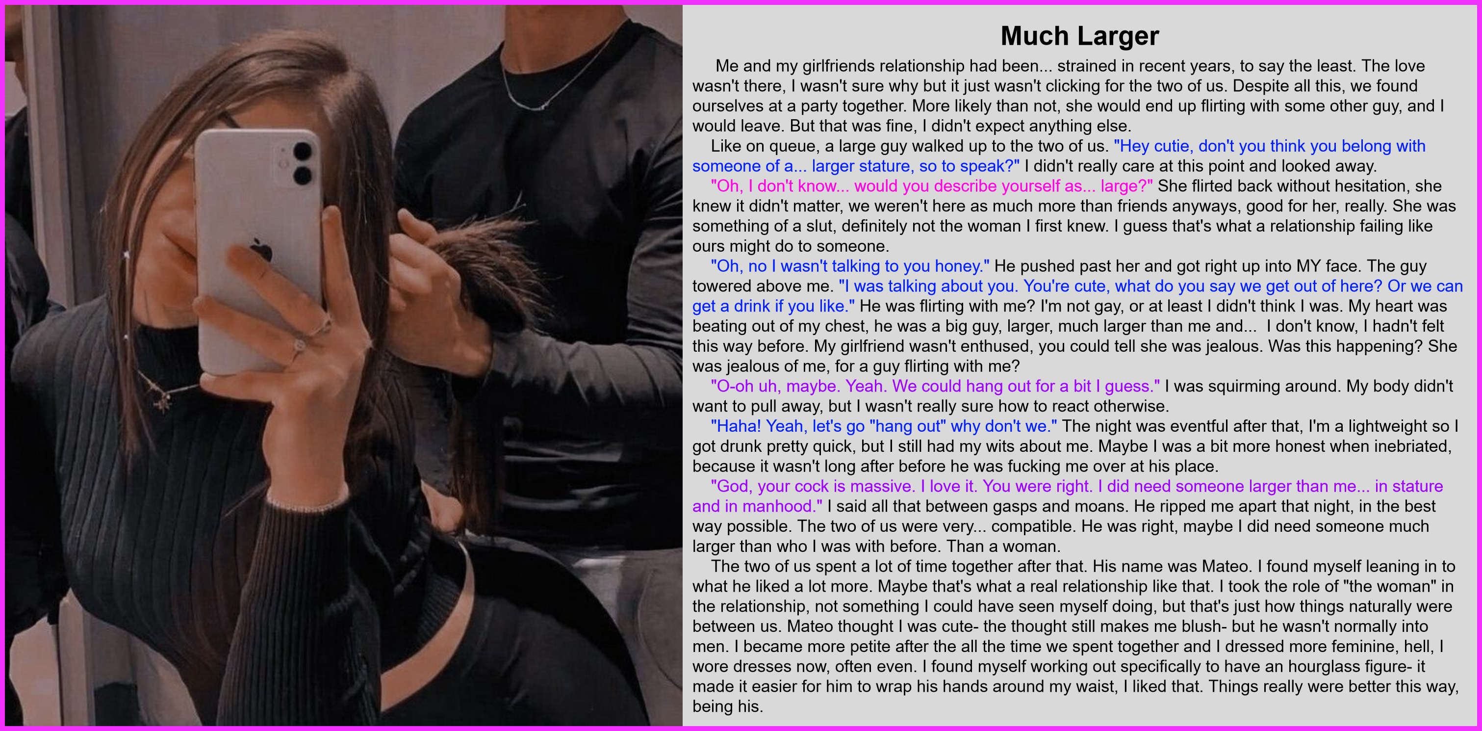 "God, your cock is massive. I love it. You were right. I did need someone larger than me… in stature and manhood." I said all that between gasps and moans. He ripped me apart that night, in the best way possible. The two of us were very… compatible. He was right, maybe I did need someone much larger than who I was with before. Than a woman.