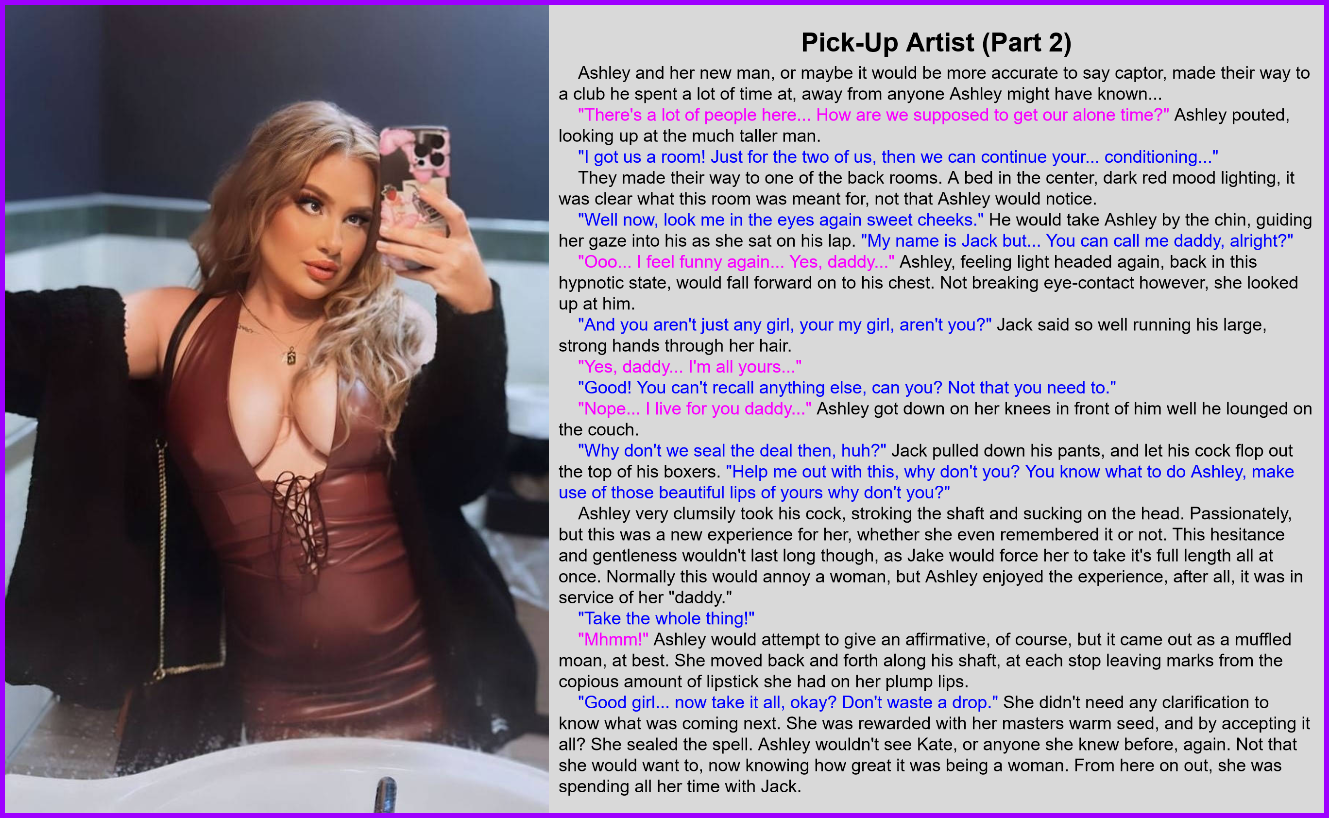 "Well now, look me in the eyes again sweet cheeks." He would take Ashley by the chin, guiding her gaze into his as she sat on his lap. "My name is Jack but… You can call me daddy, alright?"