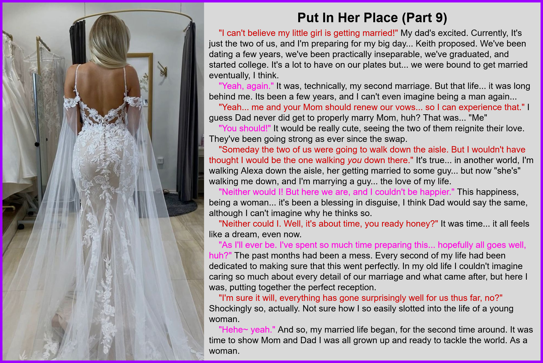 "Yeah, again." It was, technically, my second marriage. But that life… it was long behind me. Its been a few years, and I can't even imagine being a man again…