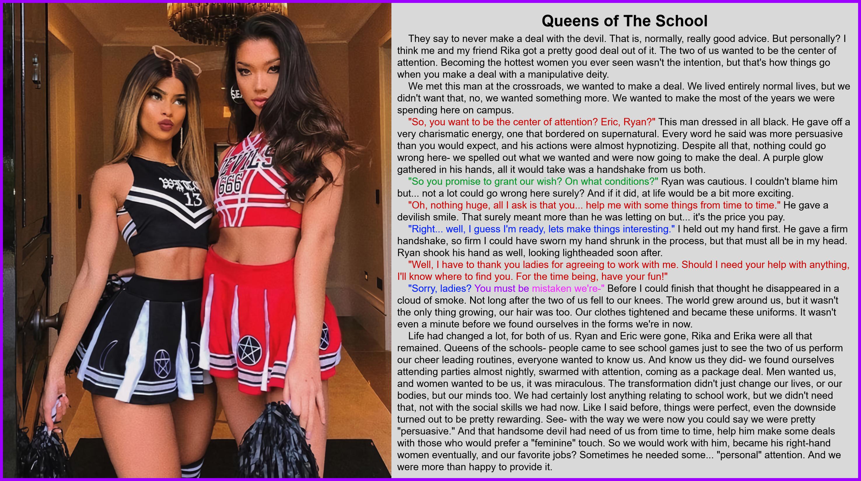 Life had changed a lot, for both of us. Ryan and Eric were gone, Rika and Erika were all that remained. Queens of the schools- people came to see school games just to see the two of us perform our cheer leading routines, everyone wanted to know us. And know us they did- we found ourselves attending parties almost nightly, swarmed with attention, coming as a package deal. Men wanted us, and women wanted to be us, it was miraculous. The transformation didn't just change our lives, or our bodies, but our minds too. We had certainly lost anything relating to school work, but we didn't need that, not with the social skills we had now. Like I said before, things were perfect, even the downside turned out to be pretty rewarding. See- with the way we were now you could say we were pretty "persuasive." And that handsome devil had need of us from time to time, help him make some deals with those who would prefer a "feminine" touch. So we would work with him, became his right-hand women eventually, and our favorite jobs? Sometimes he needed some... "personal" attention. And we were more than happy to provide it.