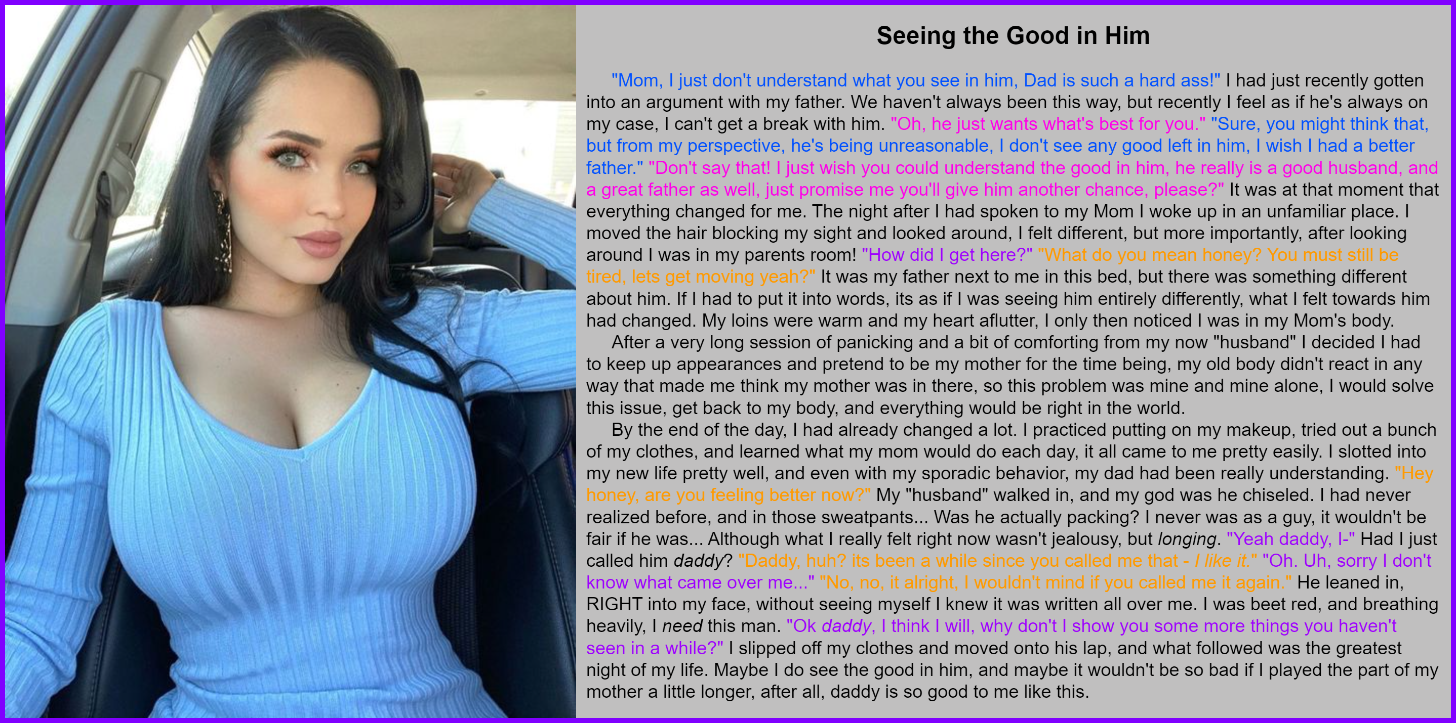 By the end of the day, I had already changed a lot. I practiced putting on my makeup, tried out a bunch of my clothes, and learned what my mom would do each day, it all came to me pretty easily. I slotted into my new life pretty well, and even with my sporadic behavior, my dad had been really understanding. "Hey honey, are you feeling better now?" My "husband" walked in, and my god was he chiseled. I had never realized before, and in those sweatpants... Was he actually packing? I never was as a guy, it wouldn't be fair if he was... Although what I really felt right now wasn't jealousy, but longing. "Yeah daddy, I-" Had I just called him daddy? "Daddy, huh? its been a while since you called me that - I like it." "Oh. Uh, sorry I don't know what came over me..." "No, no, it alright, I wouldn't mind if you called me it again." He leaned in, RIGHT into my face, without seeing myself I knew it was written all over me. I was beet red, and breathing heavily, I need this man. "Ok daddy, I think I will, why don't I show you some more things you haven't seen in a while?" I slipped off my clothes and moved onto his lap, and what followed was the greatest night of my life. Maybe I do see the good in him, and maybe it wouldn't be so bad if I played the part of my mother a little longer, after all, daddy is so good to me like this.
