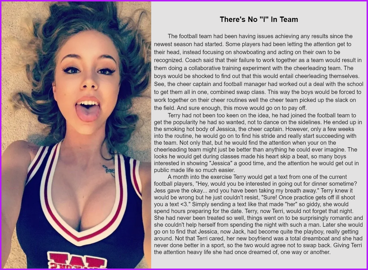 Terry had not been too keen on the idea, he had joined the football team to get the popularity he had so wanted, not to dance on the sidelines. He ended up in the smoking hot body of Jessica, the cheer captain. However, only a few weeks into the routine, he would go on to find his stride and really start succeeding with the team. Not only that, but he would find the attention when your on the cheerleading team might just be better than anything he could ever imagine. The looks he would get during classes made his heart skip a beat, so many boys interested in showing "Jessica" a good time, and the attention he would get out in public made life so much easier.