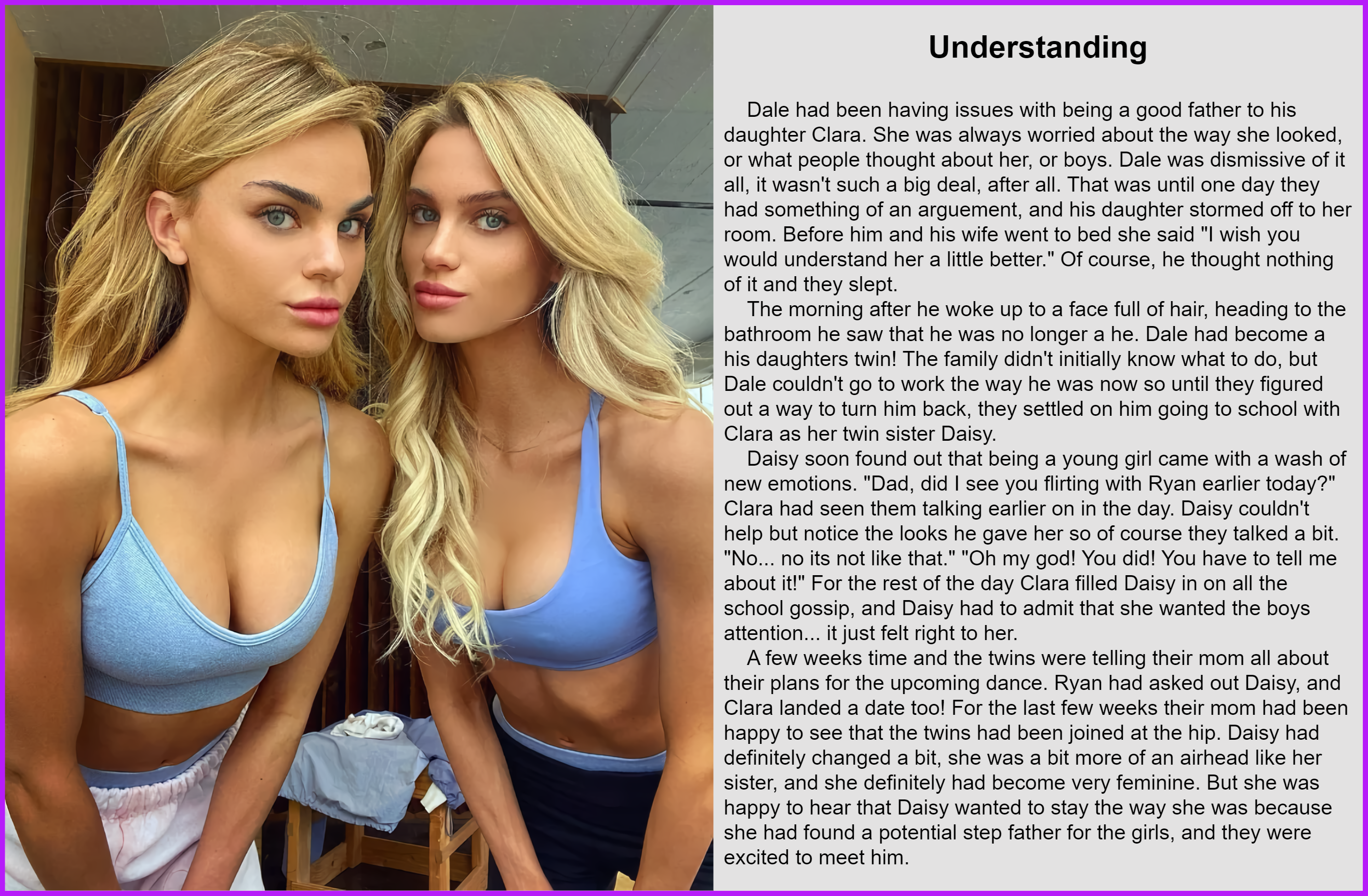 A few weeks time and the twins were telling their mom all about their plans for the upcoming dance. Ryan had asked out Daisy, and Clara landed a date too! For the last few weeks their mom had been happy to see that the twins had been joined at the hip. Daisy had definitely changed a bit, she was a bit more of an airhead like her sister, and she definitely had become very feminine. But she was happy to hear that Daisy wanted to stay the way she was because she had found a potential step father for the girls, and they were excited to meet