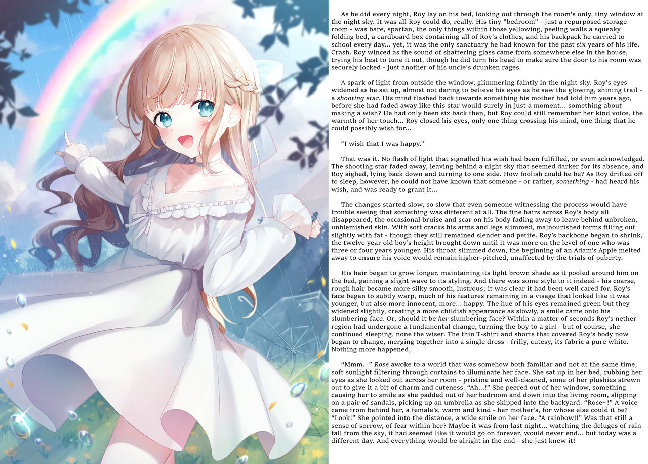 His hair began to grow longer, maintaining its light brown shade as it pooled around him on the bed, gaining a slight wave to its styling. And there was some style to it indeed - his coarse, rough hair became more silky smooth, lustrous; it was clear it had been well cared for. Roy’s face began to subtly warp, much of his features remaining in a visage that looked like it was younger, but also more innocent, more… happy. The hue of his eyes remained green but they widened slightly, creating a more childish appearance as slowly, a smile came onto his slumbering face. Or, should it be her slumbering face? Within a matter of seconds Roy’s nether region had undergone a fundamental change, turning the boy to a girl - but of course, she continued sleeping, none the wiser. The thin T-shirt and shorts that covered Roy’s body now began to change, merging together into a single dress - frilly, cutesy, its fabric a pure white. Nothing more happened,