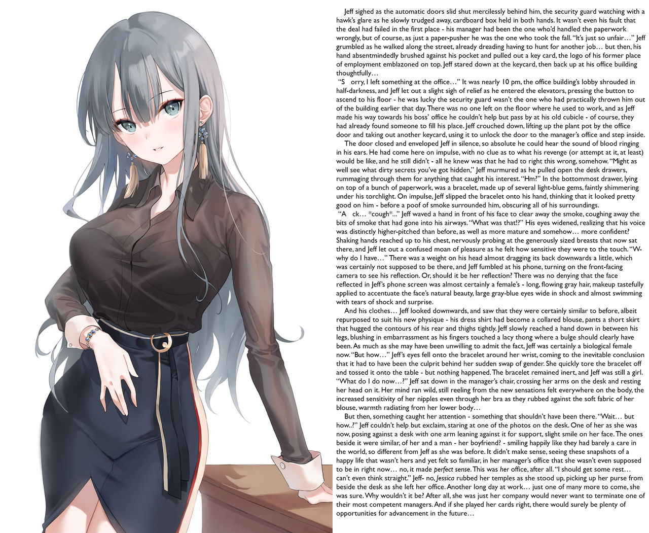 And his clothes… Jeff looked downwards, and saw that they were certainly similar to before, albeit repurposed to suit his new physique - his dress shirt had become a collared blouse, pants a short skirt that hugged the contours of his rear and thighs tightly. Jeff slowly reached a hand down in between his legs, blushing in embarrassment as his fingers touched a lacy thong where a bulge should clearly have been. As much as she may have been unwilling to admit the fact, Jeff was certainly a biological female now. “But how…” Jeff’s eyes fell onto the bracelet around her wrist, coming to the inevitable conclusion that it had to have been the culprit behind her sudden swap of gender. She quickly tore the bracelet off and tossed it onto the table - but nothing happened. The bracelet remained inert, and Jeff was still a girl. “What do I do now…?” Jeff sat down in the manager’s chair, crossing her arms on the desk and resting her head on it. Her mind ran wild, still reeling from the new sensations felt everywhere on the body, the increased sensitivity of her nipples even through her bra as they rubbed against the soft fabric of her blouse, warmth radiating from her lower body…