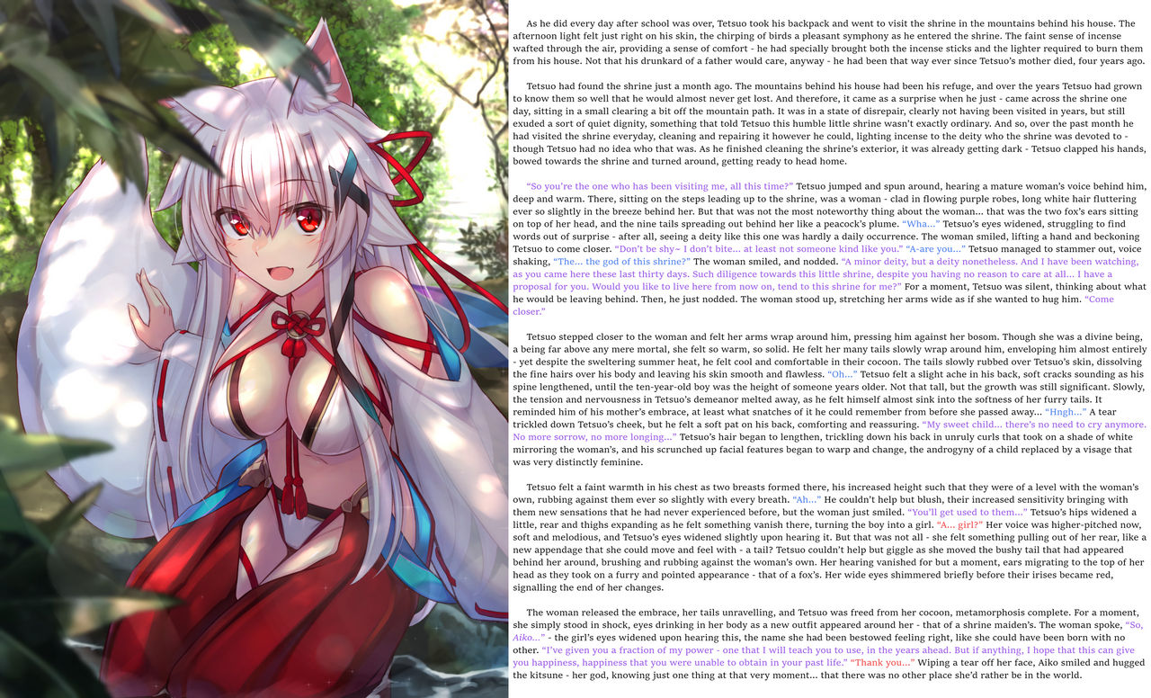 Tetsuo felt a faint warmth in his chest as two breasts formed there, his increased height such that they were of a level with the woman’s own, rubbing against them ever so slightly with every breath. “Ah…” He couldn’t help but blush, their increased sensitivity bringing with them new sensations that he had never experienced before, but the woman just smiled. “You’ll get used to them…” Tetsuo’s hips widened a little, rear and thighs expanding as he felt something vanish there, turning the boy into a girl. “A… girl?” Her voice was higher-pitched now, soft and melodious, and Tetsuo’s eyes widened slightly upon hearing it. But that was not all - she felt something pulling out of her rear, like a new appendage that she could move and feel with - a tail? Tetsuo couldn’t help but giggle as she moved the bushy tail that had appeared behind her around, brushing and rubbing against the woman’s own. Her hearing vanished for but a moment, ears migrating to the top of her head as they took on a furry and pointed appearance - that of a fox’s. Her wide eyes shimmered briefly before their irises became red, signalling the end of her changes.