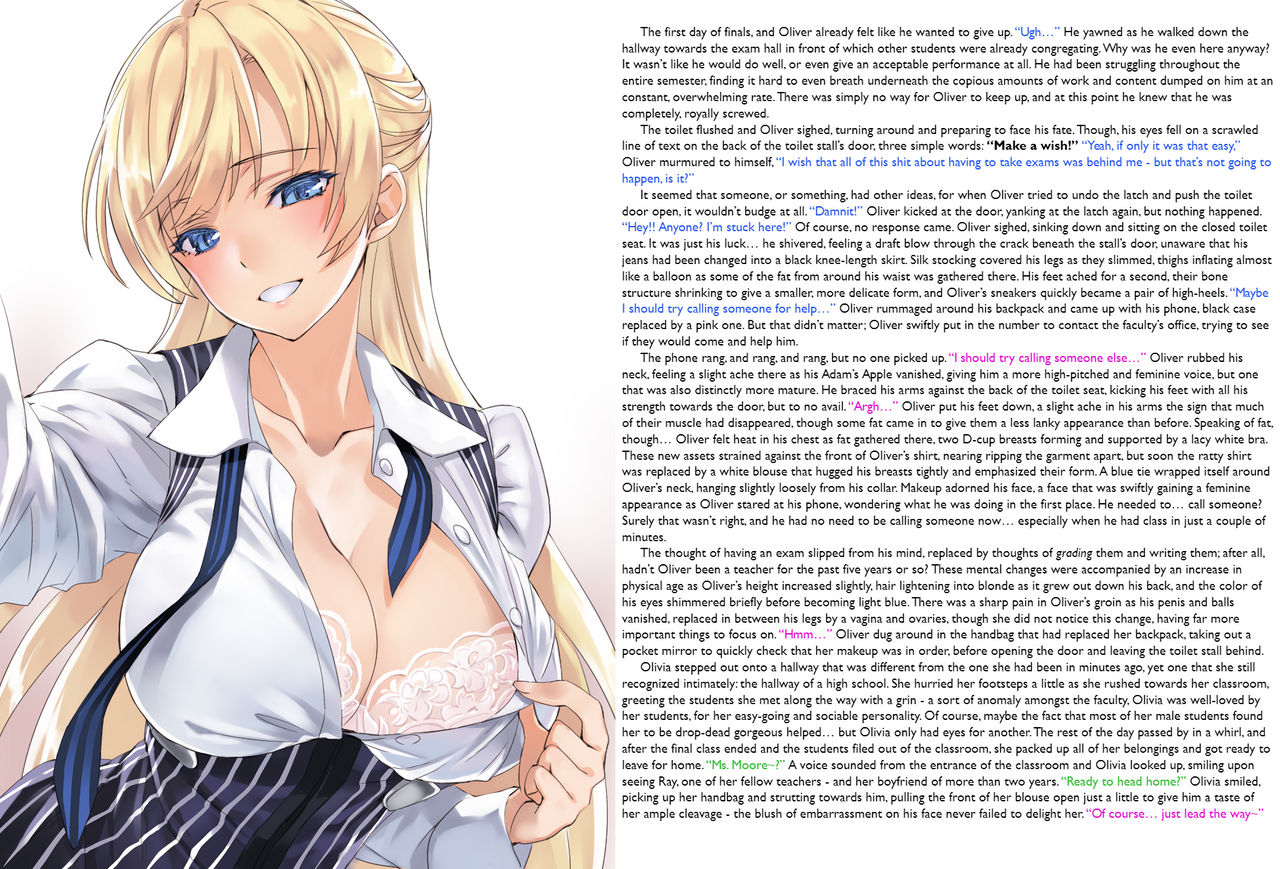 The thought of having an exam slipped from his mind, replaced by grading them and writing them; after all, hadn’t Oliver been a teacher for the past five years or so? These mental changes were accompanied by an increase in physical age as Oliver’s height increased slightly, hair lightening into blonde as it grew out down his back, and the colour of his eyes shimmered briefly before becoming light blue. There was a sharp pain in Oliver’s groin as his penis and balls vanished, replaced in between his legs by a vagina and ovaries, though she did not notice this change, having far more important things to focus on. “Hmm…” Oliver dug around in the handbag that had replaced her backpack, taking out a pocket mirror to quickly check that her makeup was in order, before opening the door and leaving the toilet stall behind.