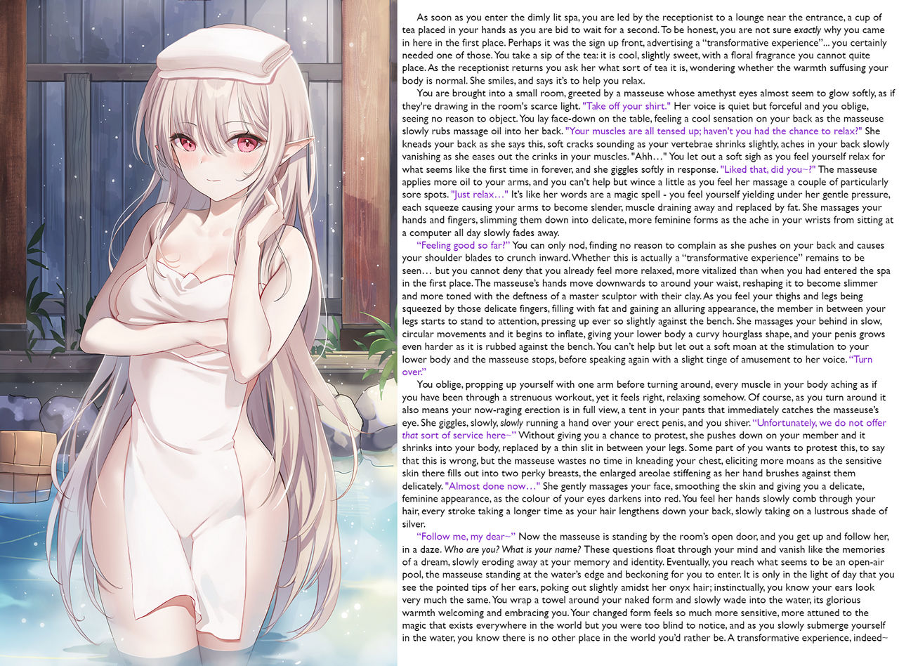 “Follow me, my dear~” Now the masseuse is standing by the room’s open door, and you get up and follow her, in a daze. Who are you? What is your name? These questions float through your mind and vanish like the memories of a dream, slowly eroding away at your memory and identity. Eventually, you reach what seems to be an open-air pool, the masseuse standing at the water’s edge and beckoning for you to enter. It is only in the light of day that you see the pointed tips of her ears, poking out slightly amidst her onyx hair; instinctually, you know your ears look very much the same. You wrap a towel around your naked form and slowly wade into the water, its glorious warmth welcoming and embracing you. Your changed form feels so much more sensitive, more attuned to the magic that exists everywhere in the world but you were too blind to notice, and as you slowly submerge yourself in the water, you know there is no other place in the world you’d rather be. A transformative experience, indeed~