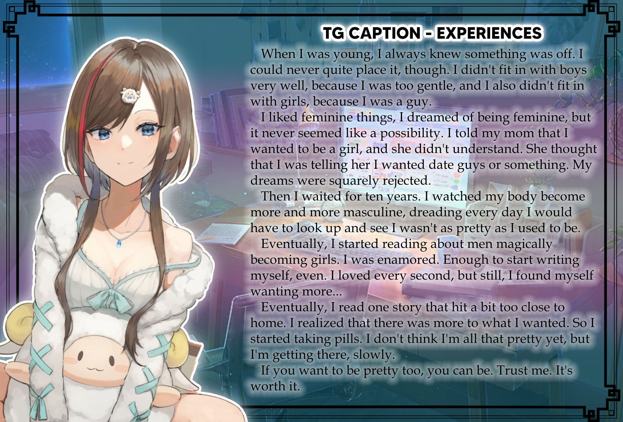 Over the past 4-5 years, I have significantly changed as a person. I mean, if you compare my oldest captions to my newest stuff, you would probably have no clue they're written by the same person. I have been reading captions for over 10 years now. TG captions, for me, have always been an escape from worrying about gender dysphoria in real life. By viewing my transition desires as nothing more than a fetish, I was able to more easily deal with the dysphoria associated with it. Obviously, I can't speak for everyone. HOWEVER. If you relate to my sentiment, I highly encourage you to reconsider your relationship with gender. For example, if you could press a button that would instantly and harmlessly turn you into a woman while otherwise keeping your life the same, but it breaks as pressed, would you still press it? If so, you are probably trans. Consider talking to someone about it.