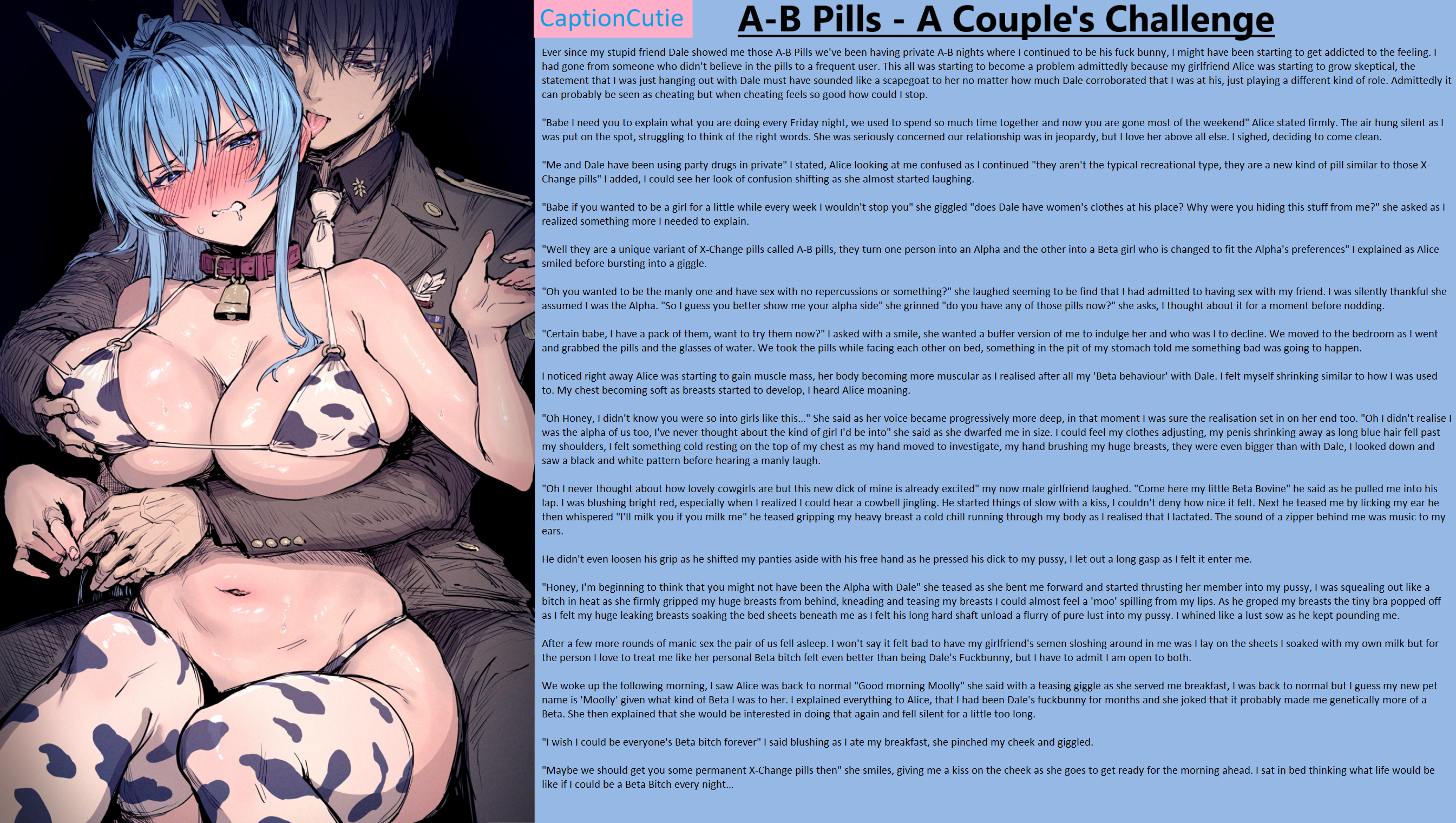 "Oh I never thought about how lovely cowgirls are but this new dick of mine is already excited" my now male girlfriend laughed. "Come here my little Beta Bovine" he said as he pulled me into his lap. I was blushing bright red, especially when I realized I could hear a cowbell jingling. He started things of slow with a kiss, I couldn't deny how nice it felt. Next he teased me by licking my ear he then whispered "I'll milk you if you milk me" he teased gripping my heavy breast a cold chill running through my body as I realised that I lactated. The sound of a zipper behind me was music to my ears.