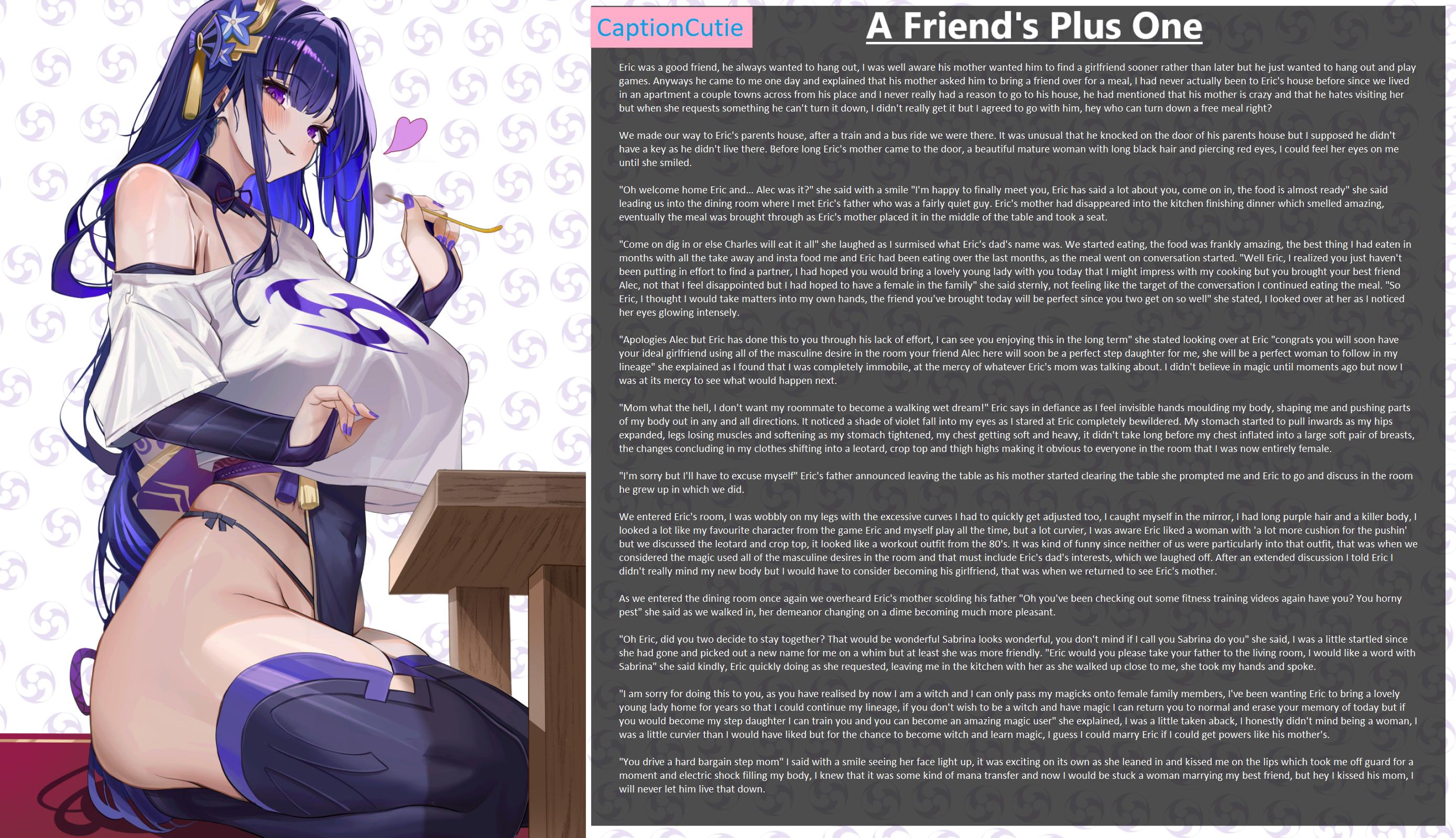 We entered Eric's room, I was wobbly on my legs with the excessive curves I had to quickly get adjusted too, I caught myself in the mirror, I had long purple hair and a killer body, I looked a lot like my favourite character from the game Eric and myself play all the time, but a lot curvier, I was aware Eric liked a woman with 'a lot more cushion for the pushin' but we discussed the leotard and crop top, it looked like a workout outfit from the 80's. It was kind of funny since neither of us were particularly into that outfit, that was when we considered the magic used all of the masculine desires in the room and that must include Eric's dad's interests, which we laughed off. After an extended discussion I told Eric I didn't really mind my new body but I would have to consider becoming his girlfriend, that was when we returned to see Eric's mother.