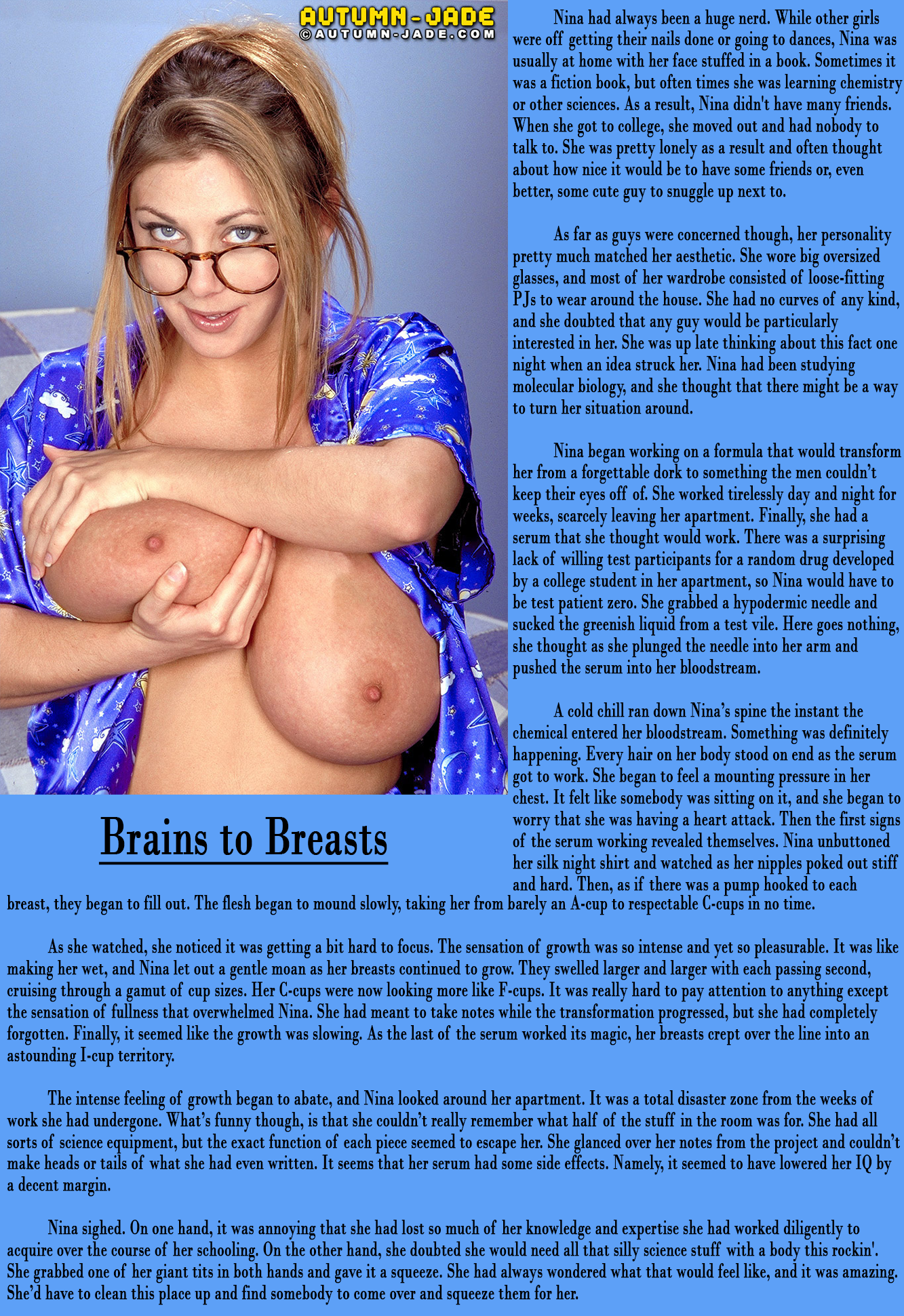 Nina sighed. On one hand, it was annoying that she had lost so much of her knowledge and expertise she had worked diligently to acquire over the course of her schooling. On the other hand, she doubted she would need all that silly science stuff with a body this rockin'. She grabbed one of her giant tits in both hands and gave it a squeeze. She had always wondered what that would feel like, and it was amazing. She’d have to clean this place up and find somebody to come over and squeeze them for her.
