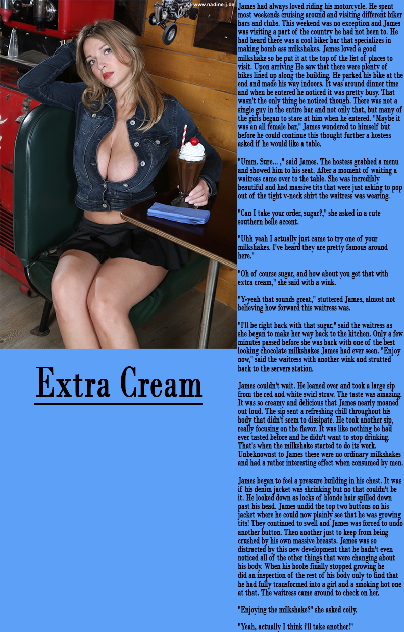 James began to feel a pressure building in his chest. It was if his denim jacket was shrinking but no that couldn't be it. He looked down as locks of blonde hair spilled down past his head. James undid the top two buttons on his jacket where he could now plainly see that he was growing tits! They continued to swell and James was forced to undo another button. Then another just to keep from being crushed by his own massive breasts. James was so distracted by this new development that he hadn't even noticed all of the other things that were changing about his body. When his boobs finally stopped growing he did an inspection of the rest of his body only to find that he had fully transformed into a girl and a smoking hot one at that. The waitress came around to check on her.
