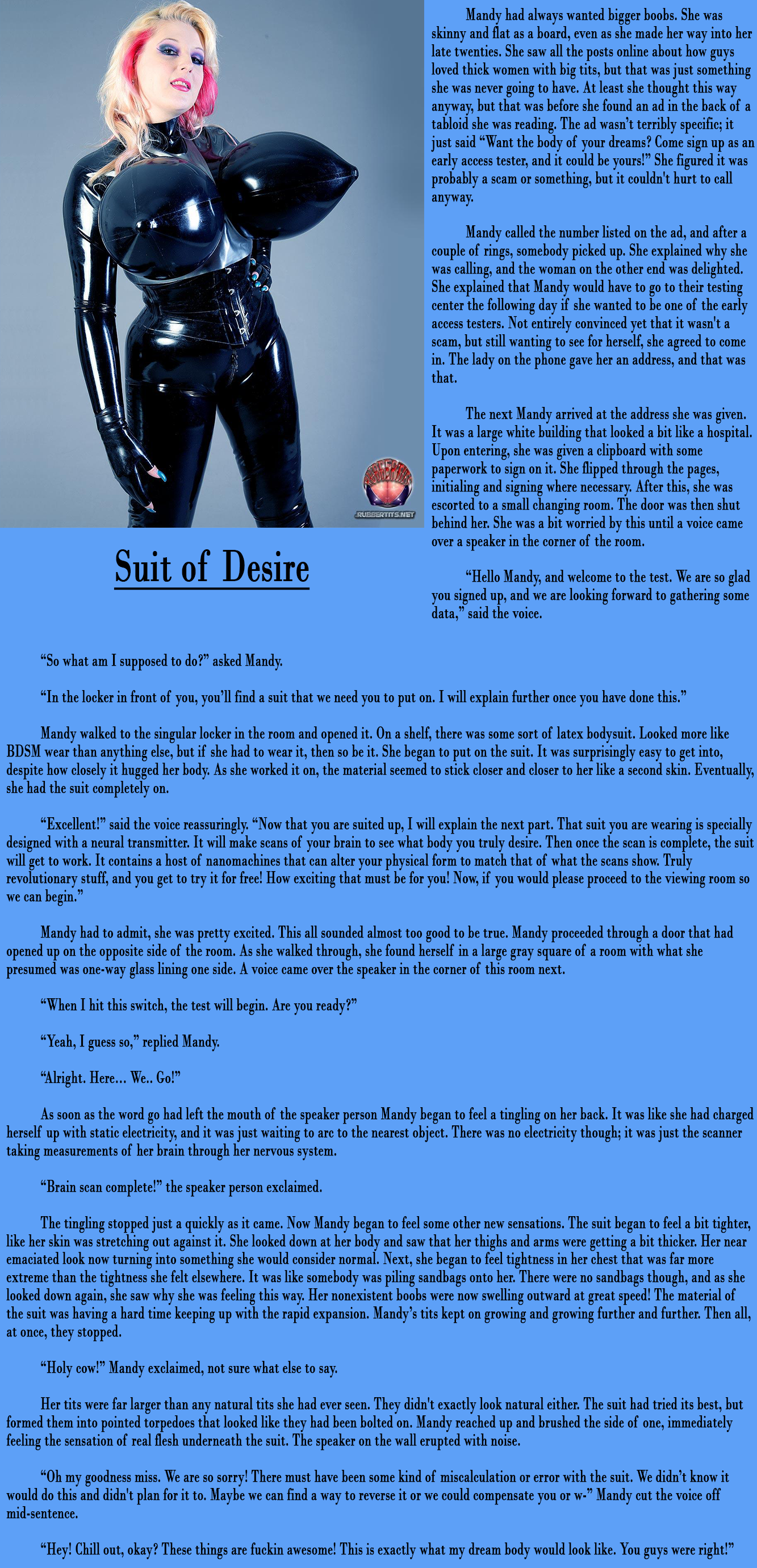 The tingling stopped just a quickly as it came. Now Mandy began to feel some other new sensations. The suit began to feel a bit tighter, like her skin was stretching out against it. She looked down at her body and saw that her thighs and arms were getting a bit thicker. Her near emaciated look now turning into something she would consider normal. Next, she began to feel tightness in her chest that was far more extreme than the tightness she felt elsewhere. It was like somebody was piling sandbags onto her. There were no sandbags though, and as she looked down again, she saw why she was feeling this way. Her nonexistent boobs were now swelling outward at great speed! The material of the suit was having a hard time keeping up with the rapid expansion. Mandy’s tits kept on growing and growing further and further. Then all, at once, they stopped.