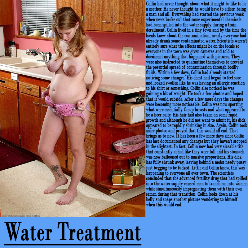 Collin had never thought about what it might be like to be a mother. He never thought he would have to either, being a man and all. Everything had started the previous week when news broke out that some experimental chemicals had been spilled into the water supply during a train derailment. Collin lived in a tiny town and by the time the locals knew about the contamination, nearly everyone had already drunk some contaminated water. Scientists weren't entirely sure what the effects might be on the locals so everyone in the town was given cameras and told to document anything that happened with pictures. They were also instructed to quarantine themselves to prevent the potential spread of contamination through bodily fluids. Within a few days, Collin had already started noticing some changes. His chest had begun to feel sore and looked swollen like he was having an allergic reaction to his shirt or something. Collin also noticed he was gaining a bit of weight. He took a few photos and hoped that it would subside. After a few more days the changes were becoming more noticeable. Collin was now sporting what were essentially C-cup breasts and what appeared to be a beer belly. His hair had also taken on some rapid growth and although he did not want to admit it, his dick appeared to be rapidly shrinking in size. Again, Collin took more photos and prayed that this would all end. That brings us to now. It has been a few more days since Collin has last documented any changes but they haven't stopped in the slightest. In fact, Collin now had very sizeable tits that constantly ached like they were full and his stomach was now ballooned out to massive proportions. His dick has fully shrunk away, leaving behind a moist needy pussy just begging to be fucked. Little did Collin know, this was happening to everyone all over town. The scientists concluded that the advanced fertility drug that had spilled into the water supply caused men to transform into women while simultaneously impregnating them with their own semen during that transition. Collin looks down at his belly and snaps another picture wondering to himself when this would end.