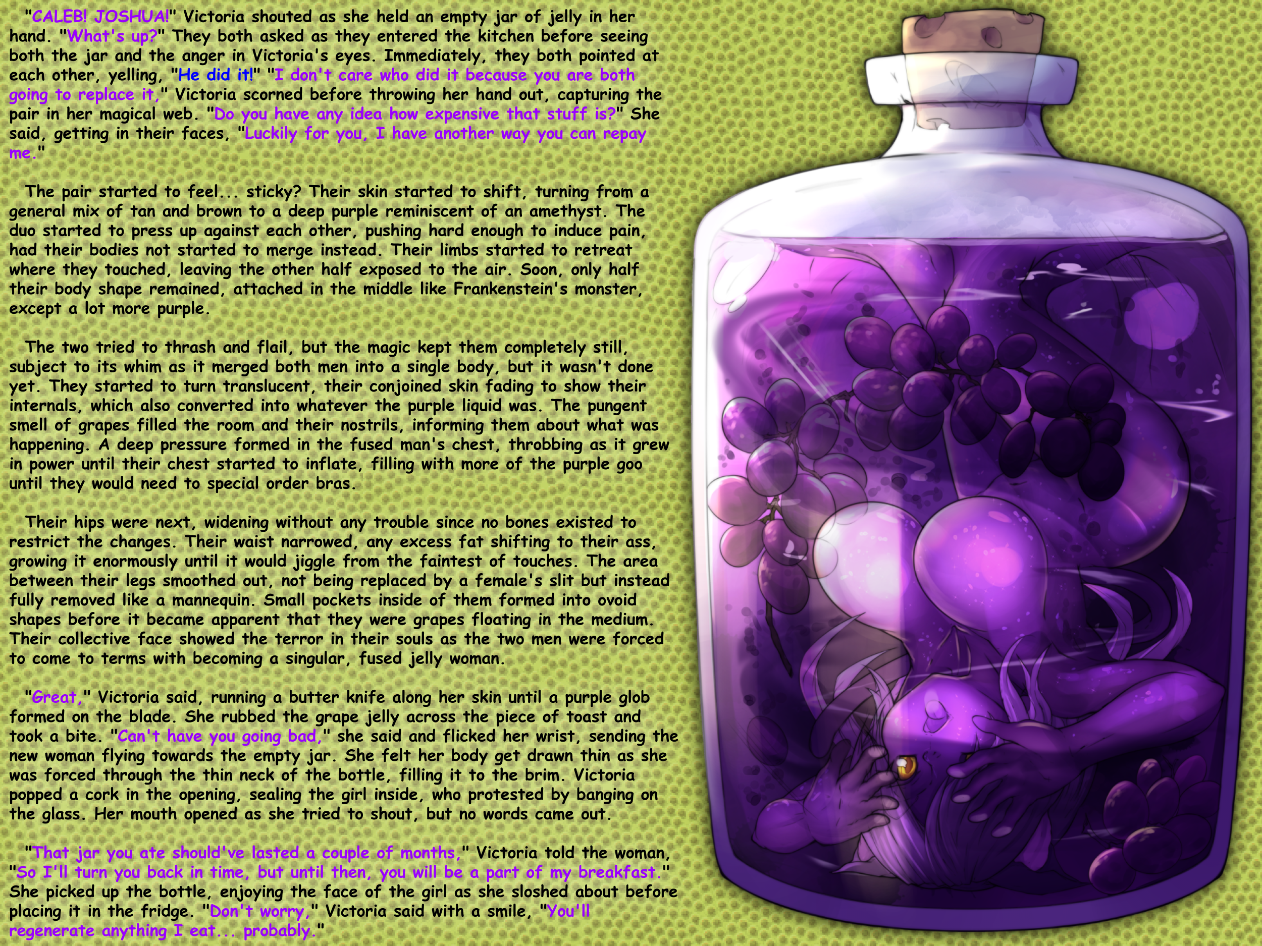 "Great," Victoria said, running a butter knife along her skin until a purple glob formed on the blade. She rubbed the grape jelly across the piece of toast and took a bite. "Can't have you going bad," she said and flicked her wrist, sending the new woman flying towards the empty jar. She felt her body get drawn thin as she was forced through the thin neck of the bottle, filling it to the brim. Victoria popped a cork in the opening, sealing the girl inside, who protested by banging on the glass. Her mouth opened as she tried to shout, but no words came out.