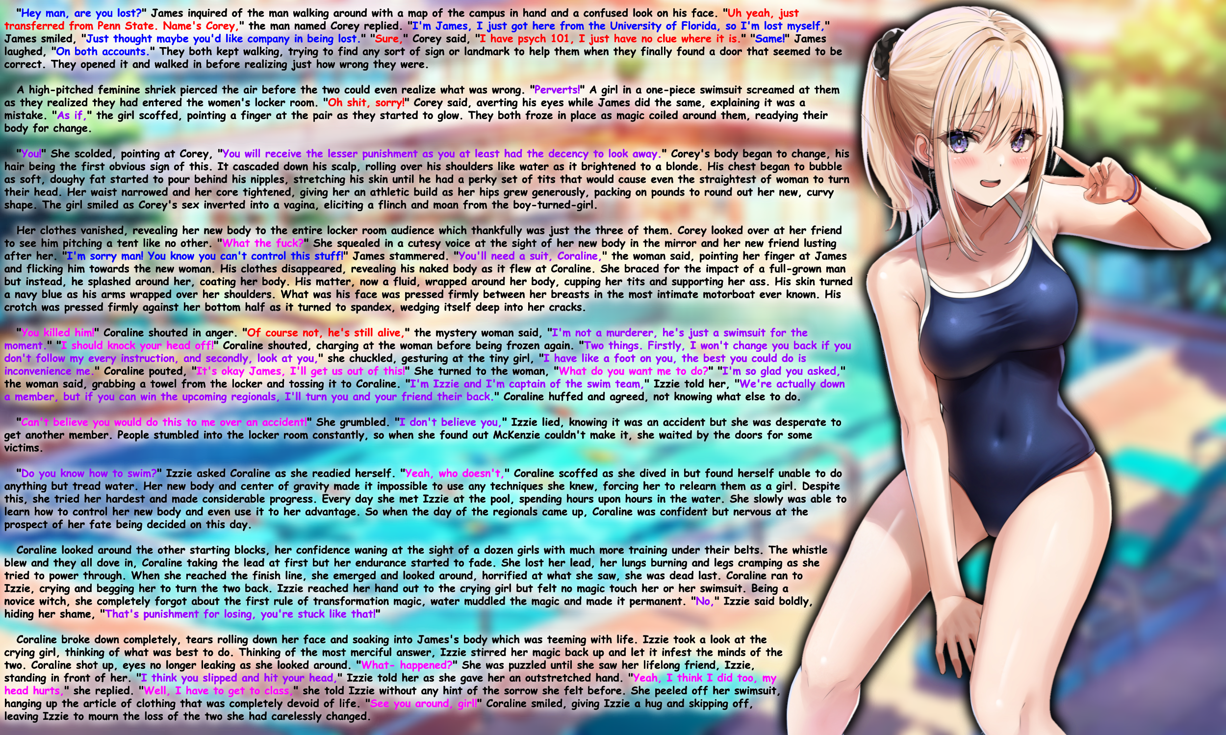 "Do you know how to swim?" Izzie asked Coraline as she readied herself. "Yeah, who doesn't," Coraline scoffed as she dived in but found herself unable to do anything but tread water. Her new body and center of gravity made it impossible to use any techniques she knew, forcing her to relearn them as a girl. Despite this, she tried her hardest and made considerable progress. Every day she met Izzie at the pool, spending hours upon hours in the water. She slowly was able to learn how to control her new body and even use it to her advantage. So when the day of the regionals came up, Coraline was confident but nervous at the prospect of her fate being decided on this day.