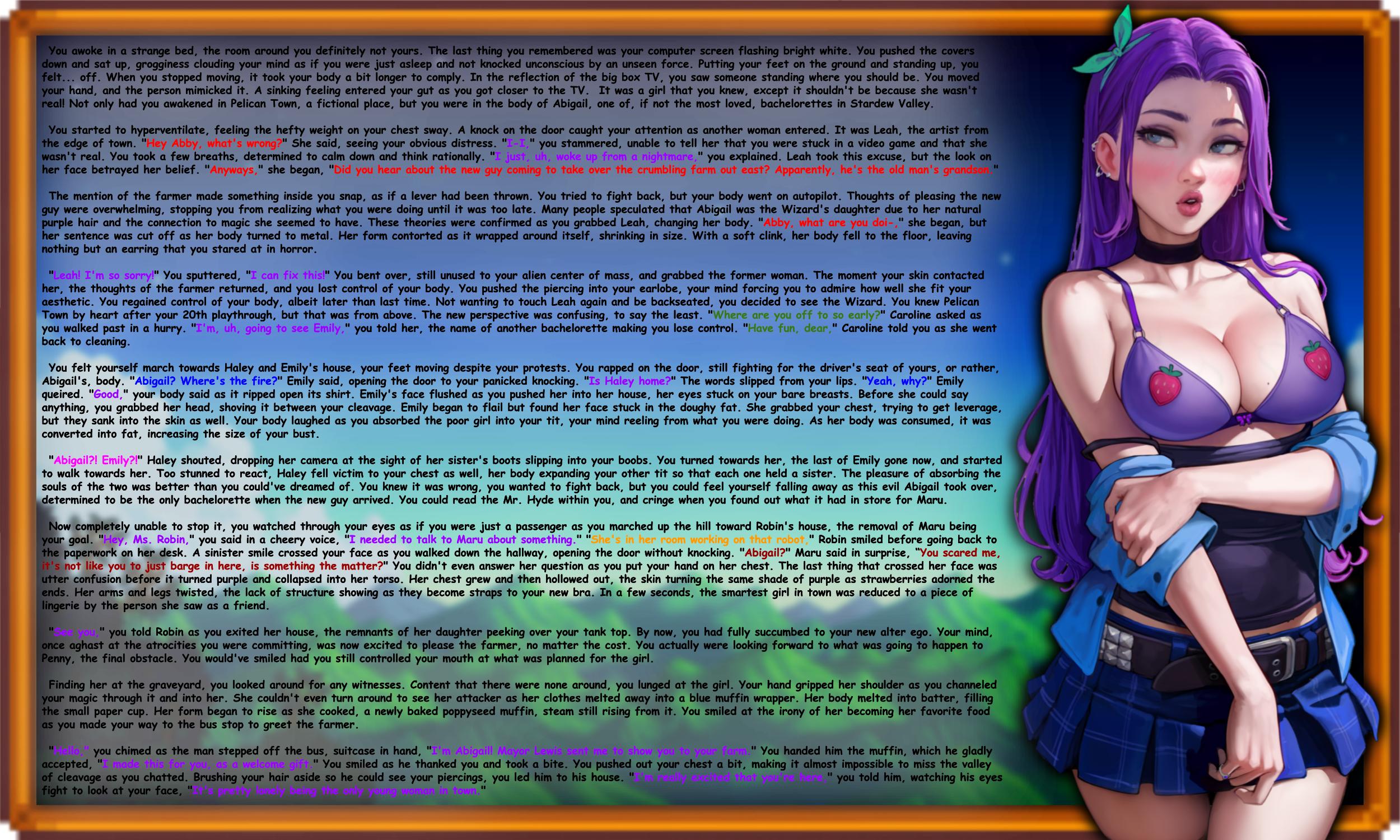 Now completely unable to stop it, you watched through your eyes as if you were just a passenger as you marched up the hill toward Robin's house, the removal of Maru being your goal. "Hey, Ms. Robin," you said in a cheery voice, "I needed to talk to Maru about something." "She's in her room working on that robot," Robin smiled before going back to the paperwork on her desk. A sinister smile crossed your face as you walked down the hallway, opening the door without knocking. "Abigail?" Maru said in surprise, "You scared me, it's not like you to just barge in here, is something the matter?" You didn't even answer her question as you put your hand on her chest. The last thing that crossed her face was utter confusion before it turned purple and collapsed into her torso. Her chest grew and then hollowed out, the skin turning the same shade of purple as strawberries adorned the ends. Her arms and legs twisted, the lack of structure showing as they become straps to your new bra. In a few seconds, the smartest girl in town was reduced to a piece of lingerie by the person she saw as a friend.