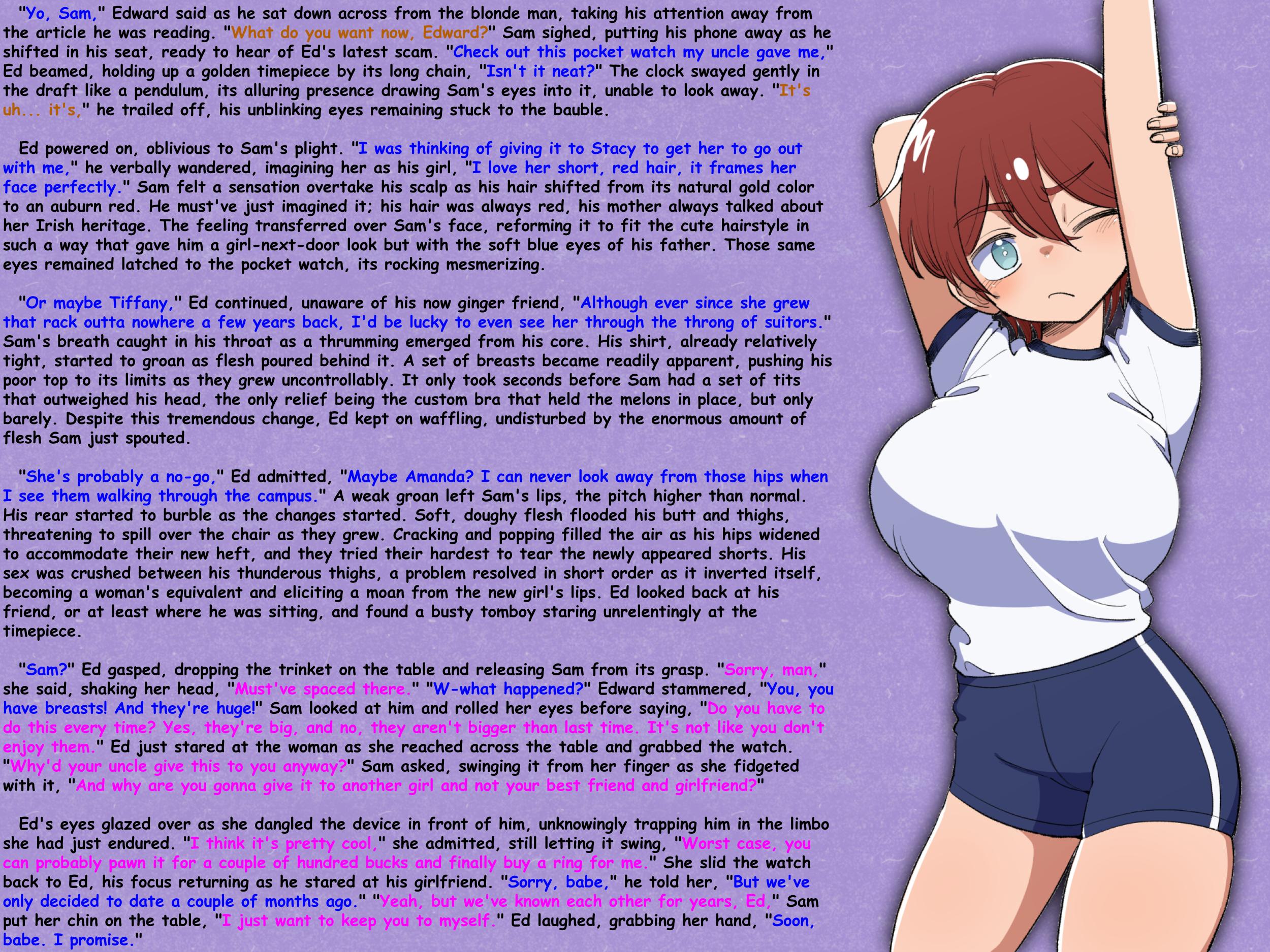 "Sam?" Ed gasped, dropping the trinket on the table and releasing Sam from its grasp. "Sorry, man," she said, shaking her head, "Must've spaced there." "W-what happened?" Edward stammered, "You, you have breasts! And they're huge!" Sam looked at him and rolled her eyes before saying, "Do you have to do this every time? Yes, they're big, and no, they aren't bigger than last time. It's not like you don't enjoy them." Ed just stared at the woman as she reached across the table and grabbed the watch. "Why'd your uncle give this to you anyway?" Sam asked, swinging it from her finger as she fidgeted with it, "And why are you gonna give it to another girl and not your best friend and girlfriend?"