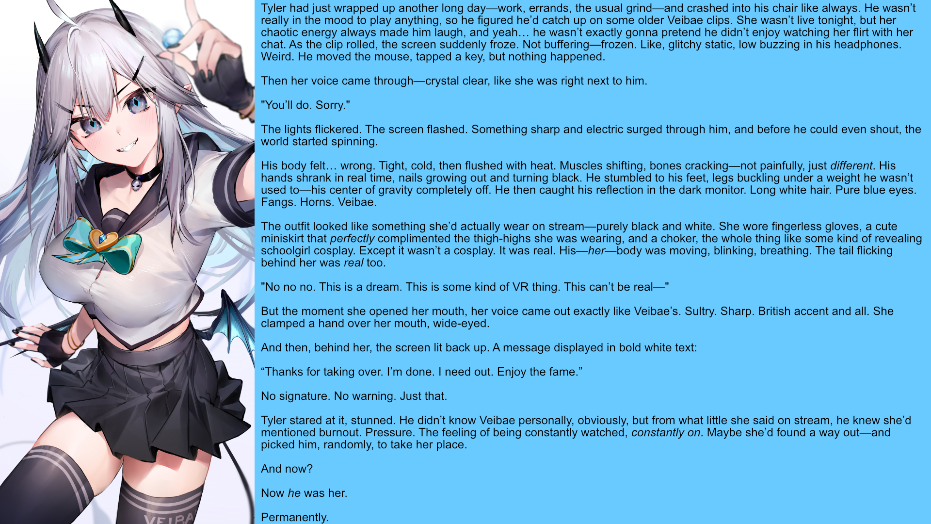 His body felt… wrong. Tight, cold, then flushed with heat. Muscles shifting, bones cracking—not painfully, just different. His hands shrank in real time, nails growing out and turning black. He stumbled to his feet, legs buckling under a weight he wasn’t used to—his center of gravity completely off. He then caught his reflection in the dark monitor. Long white hair. Pure blue eyes. Fangs. Horns. Veibae.