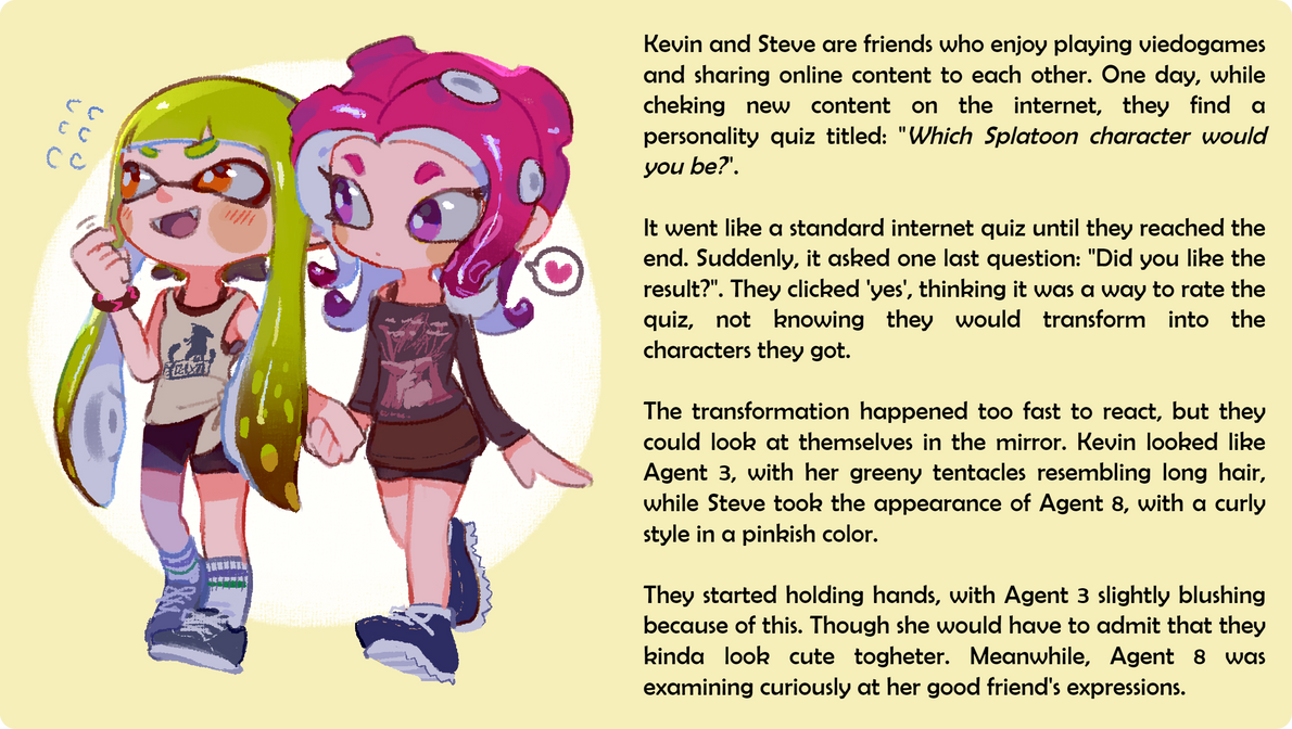 Kevin and Steve are friends who enjoy playing viedogames and sharing online content to each other. One day, while cheking new content on the internet, they find a personality quiz titled: "Which Splatoon character would you be?".