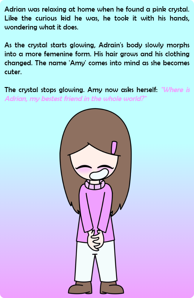 As the crystal starts glowing, Adrain's body slowly morphs into a more femenine form. His hair grows and his clothing changed. The name 'Amy' comes into mind as she becomes cuter.
