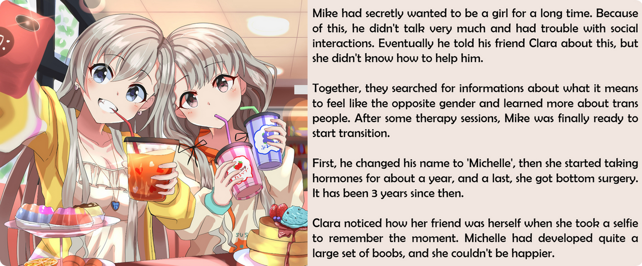 Mike had secretly wanted to be a girl for a long time. Because of this, he didn't talk very much and had trouble with social interactions. Eventually he told his friend Clara about this, but she didn't know how to help him.