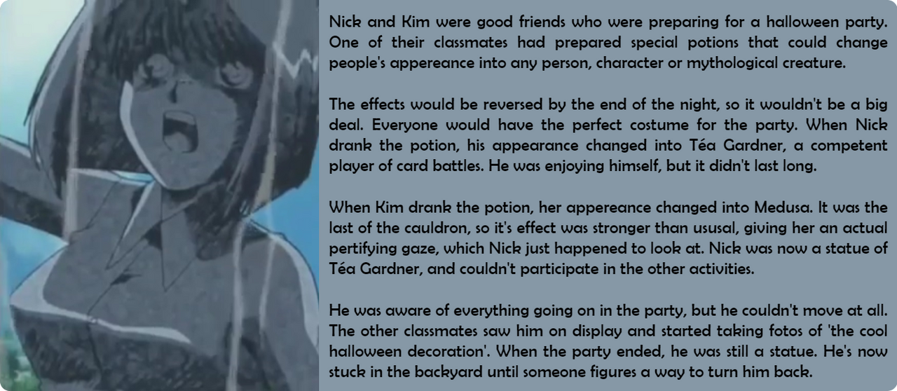 When Kim drank the potion, her appereance changed into Medusa. It was the last of the cauldron, so it's effect was stronger than usual, giving her an actual pertifying gaze, which Nick just happened to look at. Nick was now a statue of Téa Gardner, and couldn't participate in the other activities.