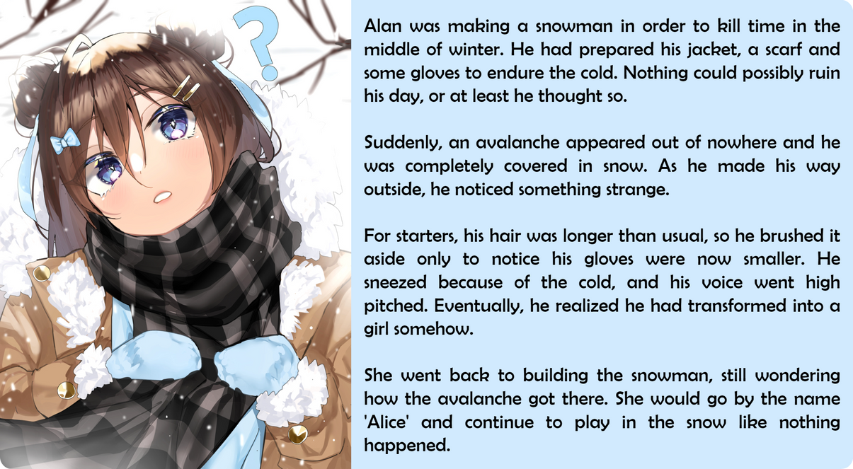 For starters, his hair was longer than usual, so he brushed it aside only to notice his gloves were now smaller. He sneezed because of the cold, and his voice went high pitched. Eventually, he realized he had transformed into a girl somehow.