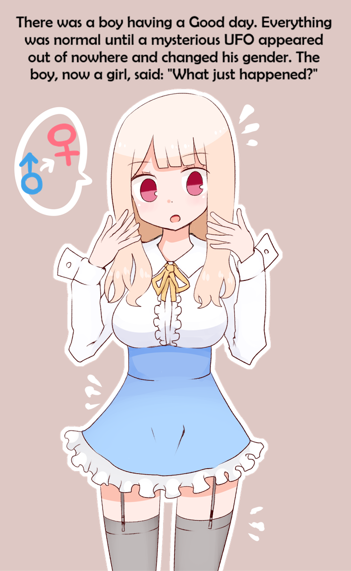 There was a boy having a Good day. Everything was normal until a mysterious UFO appeared out of nowhere and changed his gender. The boy, now a girl, said: "What just happened?"