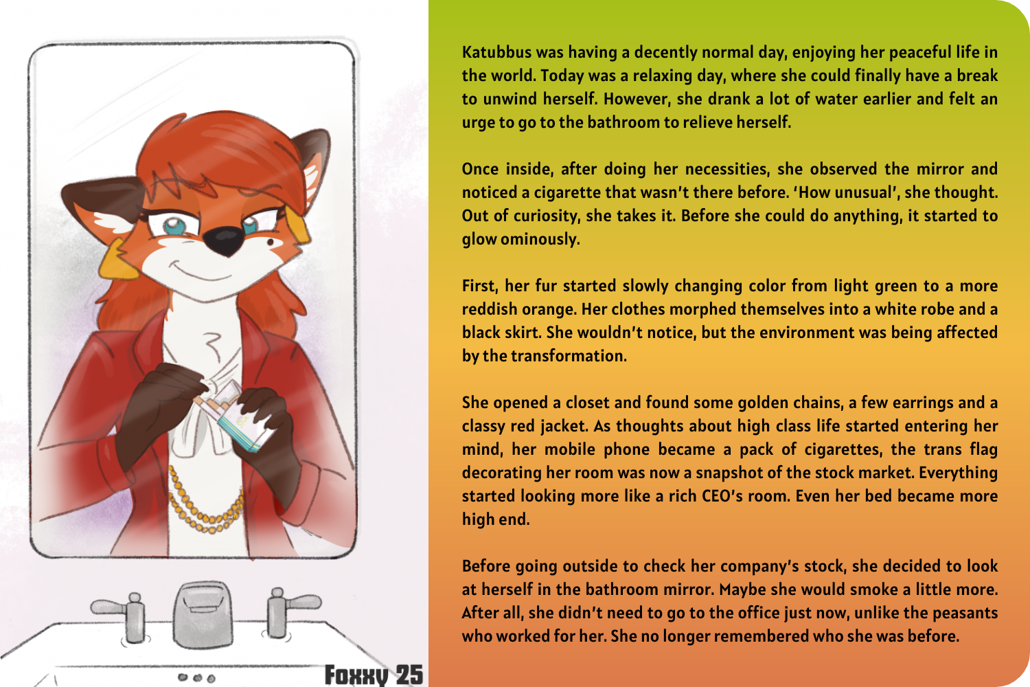First, her fur started slowly changing color from light green to a more reddish orange. Her clothes morphed themselves into a white robe and a black skirt. She wouldn’t notice, but the environment was being affected by the transformation.