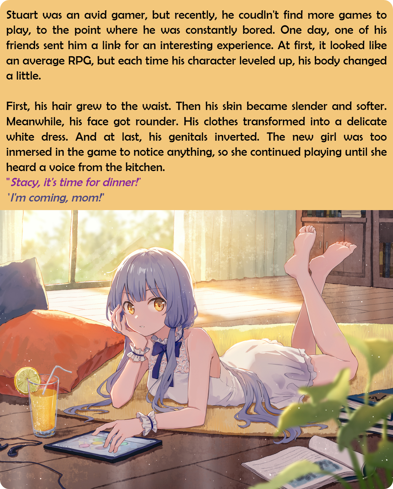 First, his hair grew to the waist. Then his skin became slender and softer. Meanwhile, his face got rounder. His clothes transformed into a delicate white dress. And at last, his genitals inverted. The new girl was too inmersed in the game to notice anything, so she continued playing until she heard a voice from the kitchen.