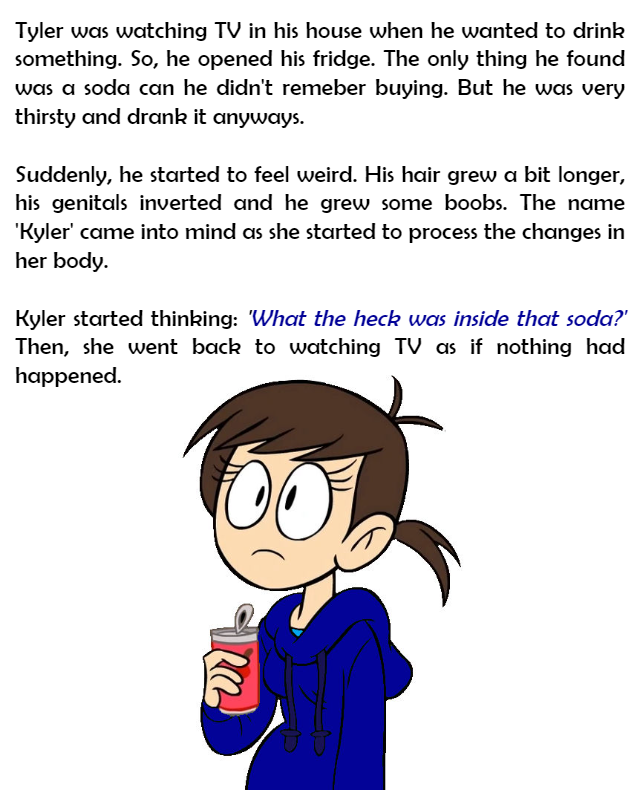 Suddenly, he started to feel weird. His hair grew a bit longer, his genitals inverted and he grew some boobs. The name 'Kyler' came into mind as she started to process the changes in her body.