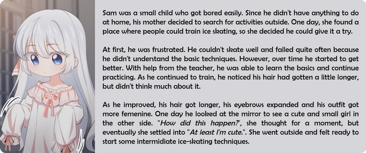 As he improved, his hair got longer, his eyebrows expanded and his outfit got more femenine. One day he looked at the mirror to see a cute and small girl in the other side. "How did this happen?", she thought for a moment, but eventually she settled into "At least I'm cute.". She went outside and felt ready to start some intermidiate ice-skating techniques.