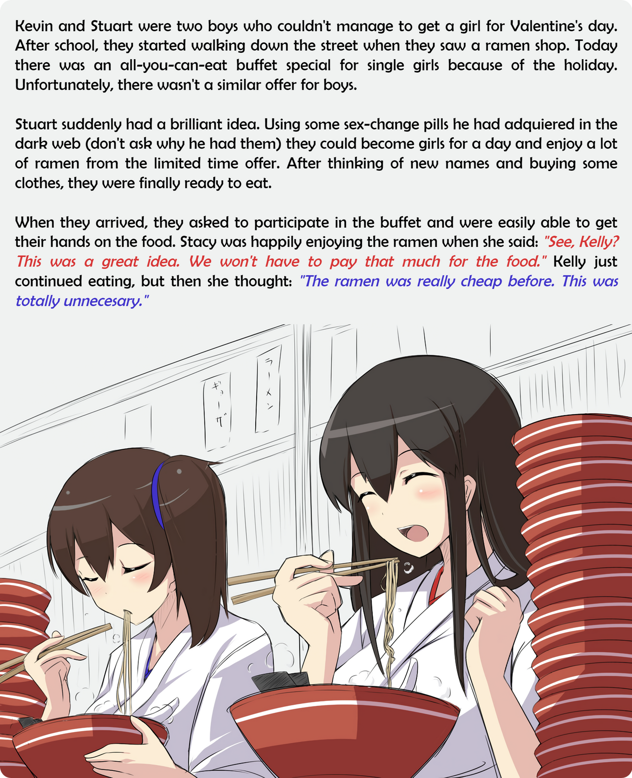 When they arrived, they asked to participate in the buffet and were easily able to get their hands on the food. Stacy was happily enjoying the ramen when she said: "See, Kelly? This was a great idea. We won't have to pay that much for the food." Kelly just continued eating, but then she thought: "The ramen was really cheap before. This was totally unnecesary."