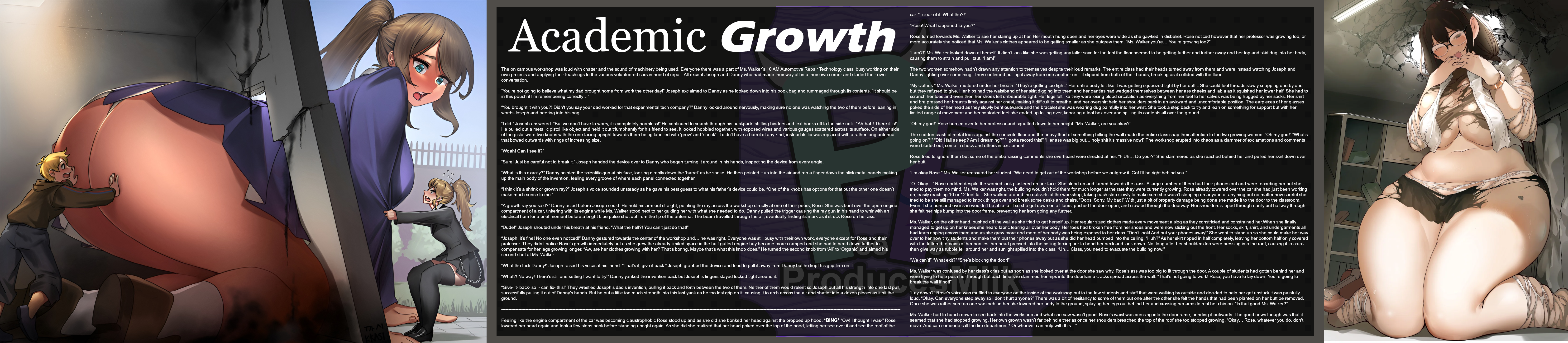 The sudden crash of metal tools against the concrete floor and the heavy thud of something hitting the wall made the entire class snap their attention to the two growing women. “Oh my god!” “What’s going on?!” “Did I fall asleep? Am I dreaming?” “I gotta record this!” “Her ass was big but… holy shit it’s massive now!” The workshop erupted into chaos as a clammer of exclamations and comments were blurted out, some in shock and others in excitement.