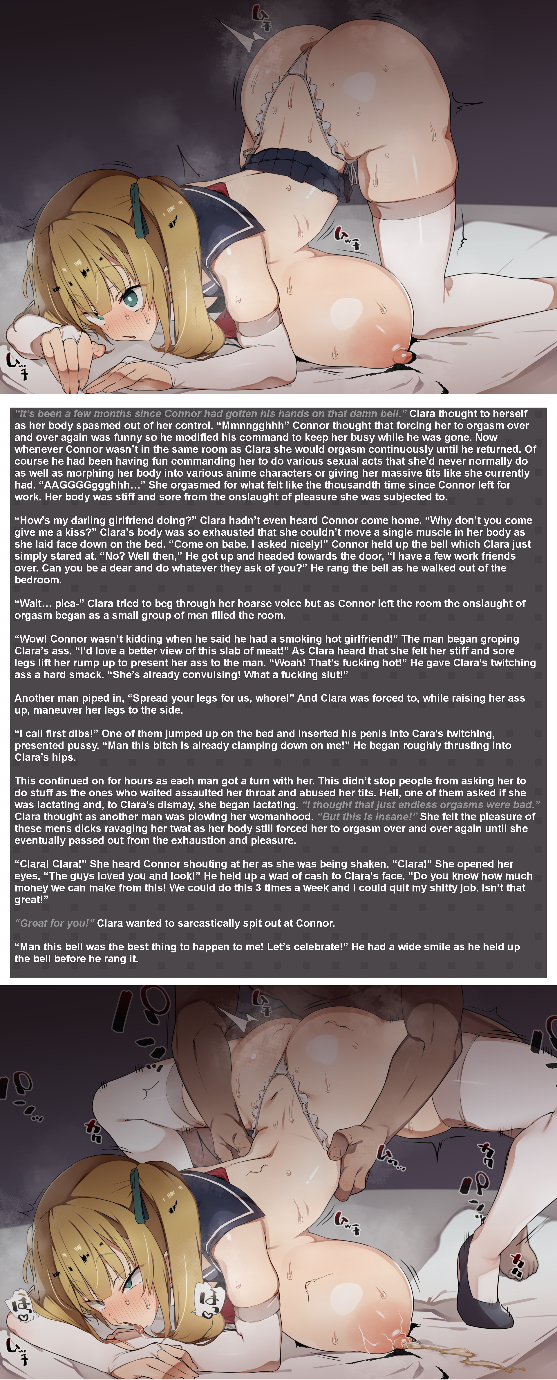 “It’s been a few months since Connor had gotten his hands on that damn bell.” Clara thought to herself as her body spasmed out of her control. “Mmnngghhh” Connor thought that forcing her to orgasm over and over again was funny so he modified his command to keep her busy while he was gone. Now whenever Connor wasn’t in the same room as Clara she would orgasm continuously until he returned. Of course he had been having fun commanding her to do various sexual acts that she’d never normally do as well as morphing her body into various anime characters or giving her massive tits like she currently had. “AAGGGGggghhh…” She orgasmed for what felt like the thousandth time since Connor left for work. Her body was stiff and sore from the onslaught of pleasure she was subjected to.