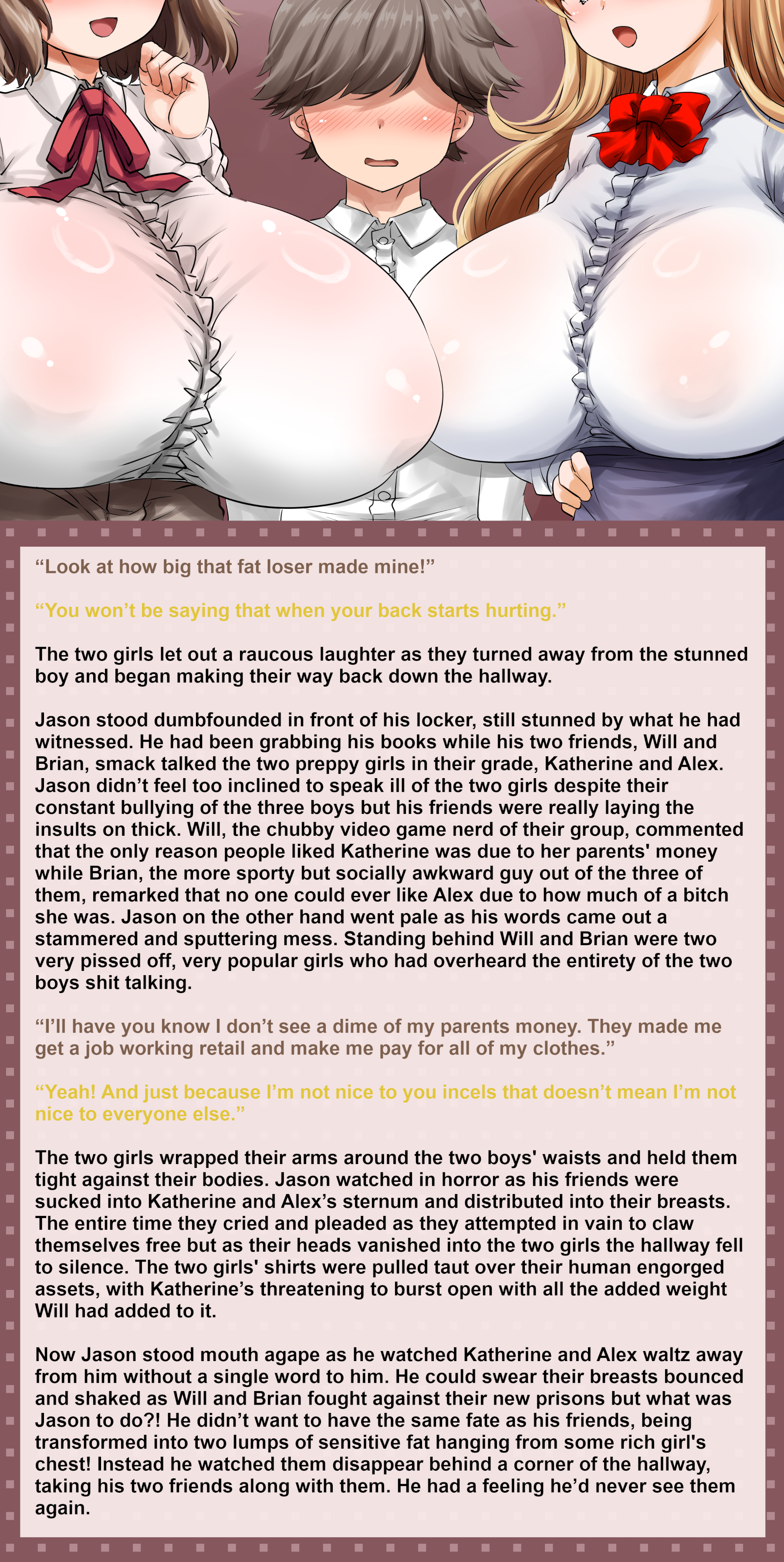 Now Jason stood mouth agape as he watched Katherine and Alex waltz away from him without a single word to him. He could swear their breasts bounced and shaked as Will and Brian fought against their new prisons but what was Jason to do?! He didn’t want to have the same fate as his friends, being transformed into two lumps of sensitive fat hanging from some rich girl's chest! Instead he watched them disappear behind a corner of the hallway, taking his two friends along with them. He had a feeling he’d never see them again.