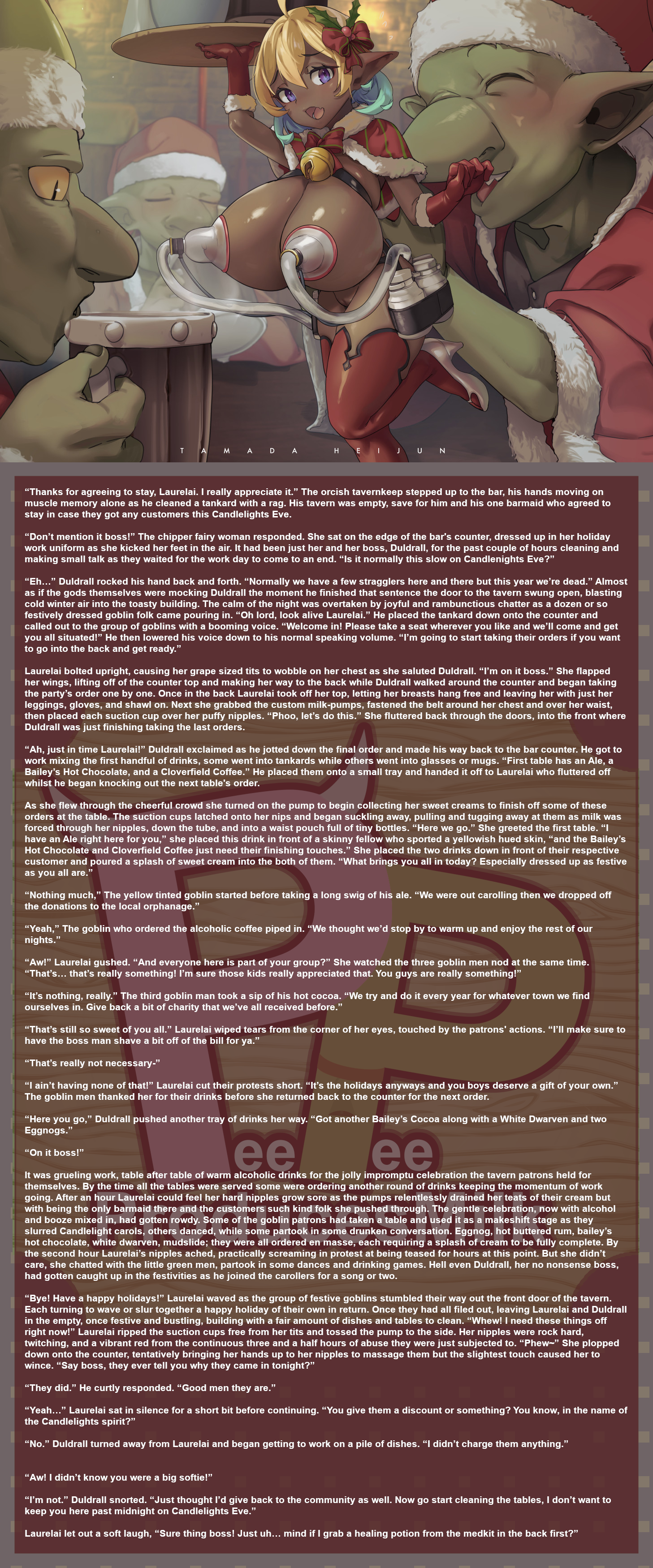 It was grueling work, table after table of warm alcoholic drinks for the jolly impromptu celebration the tavern patrons held for themselves. By the time all the tables were served some were ordering another round of drinks keeping the momentum of work going. After an hour Laurelai could feel her hard nipples grow sore as the pumps relentlessly drained her teats of their cream but with being the only barmaid there and the customers such kind folk she pushed through. The gentle celebration, now with alcohol and booze mixed in, had gotten rowdy. Some of the goblin patrons had taken a table and used it as a makeshift stage as they slurred Candlelight carols, others danced, while some partook in some drunken conversation. Eggnog, hot buttered rum, bailey’s hot chocolate, white dwarven, mudslide; they were all ordered en masse, each requiring a splash of cream to be fully complete. By the second hour Laurelai’s nipples ached, practically screaming in protest at being teased for hours at this point. But she didn’t care, she chatted with the little green men, partook in some dances and drinking games. Hell even Duldrall, her no nonsense boss, had gotten caught up in the festivities as he joined the carollers for a song or two.