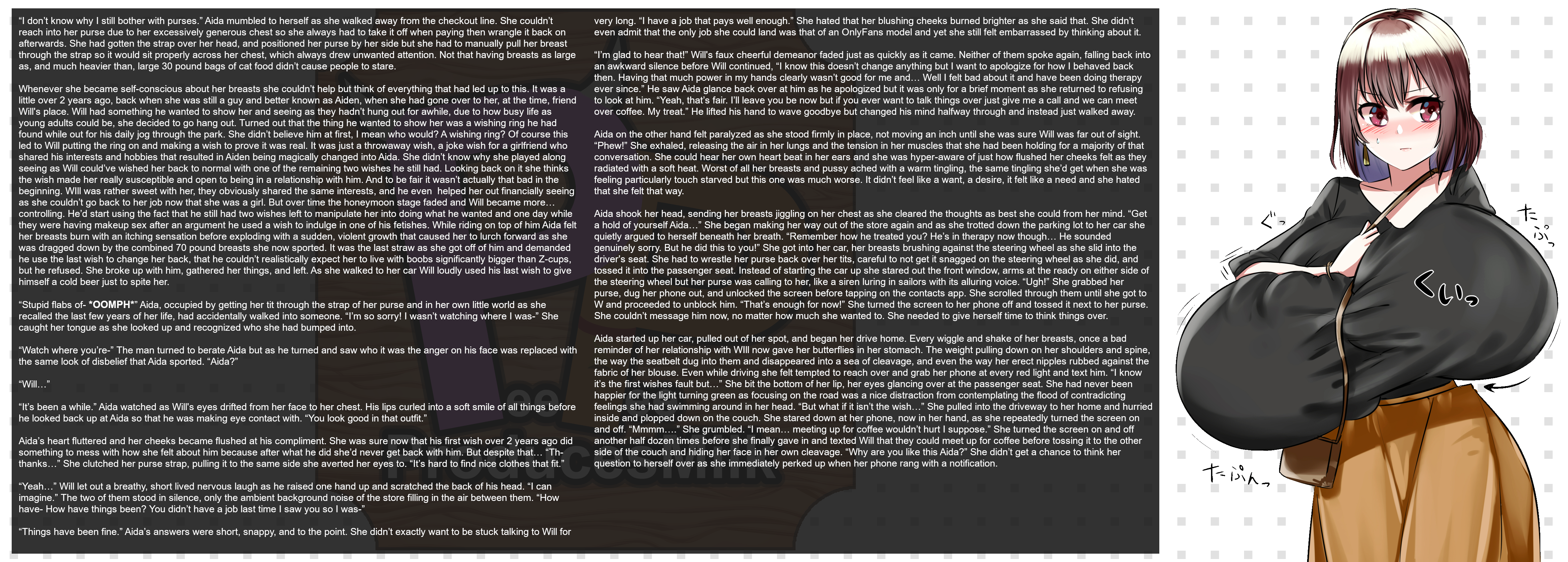 Aida started up her car, pulled out of her spot, and began her drive home. Every wiggle and shake of her breasts, once a bad reminder of her relationship with WIll now gave her butterflies in her stomach. The weight pulling down on her shoulders and spine, the way the seatbelt dug into them and disappeared into a sea of cleavage, and even the way her erect nipples rubbed against the fabric of her blouse. Even while driving she felt tempted to reach over and grab her phone at every red light and text him. “I know it’s the first wishes fault but…” She bit the bottom of her lip, her eyes glancing over at the passenger seat. She had never been happier for the light turning green as focusing on the road was a nice distraction from contemplating the flood of contradicting feelings she had swimming around in her head. “But what if it isn’t the wish…” She pulled into the driveway to her home and hurried inside and plopped down on the couch. She stared down at her phone, now in her hand, as she repeatedly turned the screen on and off. “Mmmm….” She grumbled. “I mean… meeting up for coffee wouldn’t hurt I suppose.” She turned the screen on and off another half dozen times before she finally gave in and texted Will that they could meet up for coffee before tossing it to the other side of the couch and hiding her face in her own cleavage. “Why are you like this Aida?” She didn’t get a chance to think her question to herself over as she immediately perked up when her phone rang with a notification.