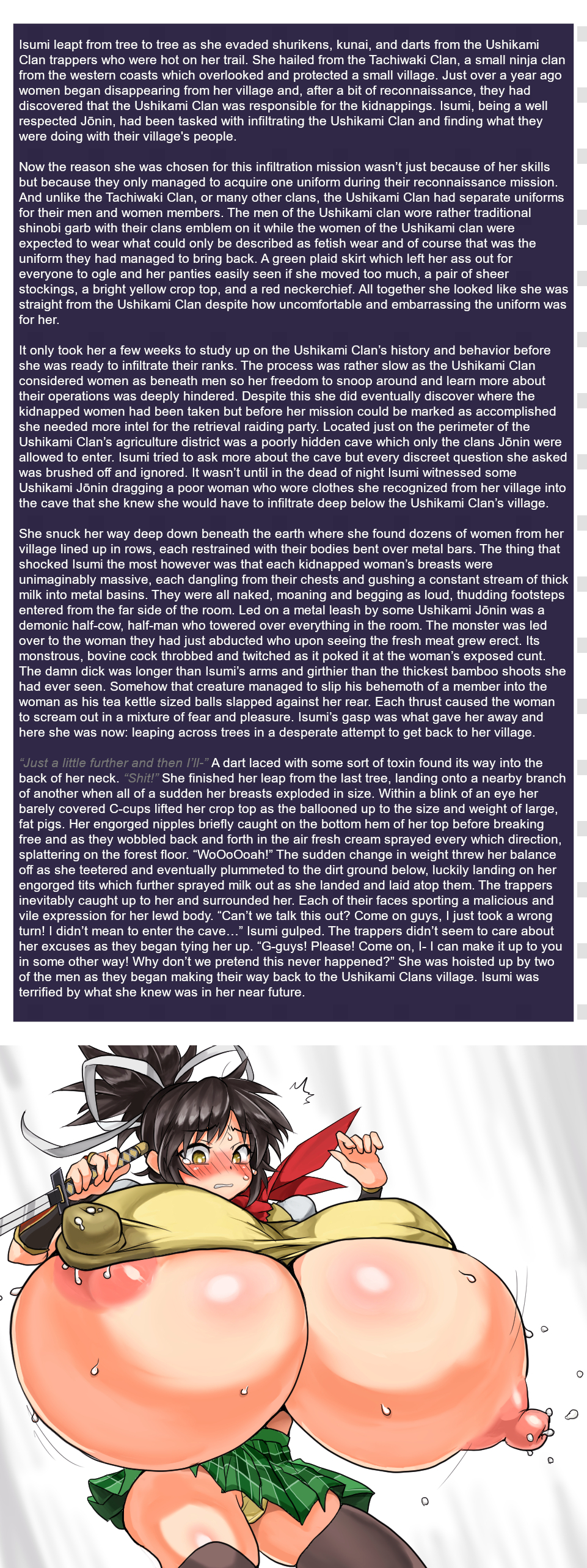 “Just a little further and then I’ll-” A dart laced with some sort of toxin found its way into the back of her neck. “Shit!” She finished her leap from the last tree, landing onto a nearby branch of another when all of a sudden her breasts exploded in size. Within a blink of an eye her barely covered C-cups lifted her crop top as the ballooned up to the size and weight of large, fat pigs. Her engorged nipples briefly caught on the bottom hem of her top before breaking free and as they wobbled back and forth in the air fresh cream sprayed every which direction, splattering on the forest floor. “WoOoOoah!” The sudden change in weight threw her balance off as she teetered and eventually plummeted to the dirt ground below, luckily landing on her engorged tits which further sprayed milk out as she landed and laid atop them. The trappers inevitably caught up to her and surrounded her. Each of their faces sporting a malicious and vile expression for her lewd body. “Can’t we talk this out? Come on guys, I just took a wrong turn! I didn’t mean to enter the cave…” Isumi gulped. The trappers didn’t seem to care about her excuses as they began tying her up. “G-guys! Please! Come on, I- I can make it up to you in some other way! Why don’t we pretend this never happened?” She was hoisted up by two of the men as they began making their way back to the Ushikami Clans village. Isumi was terrified by what she knew was in her near future.
