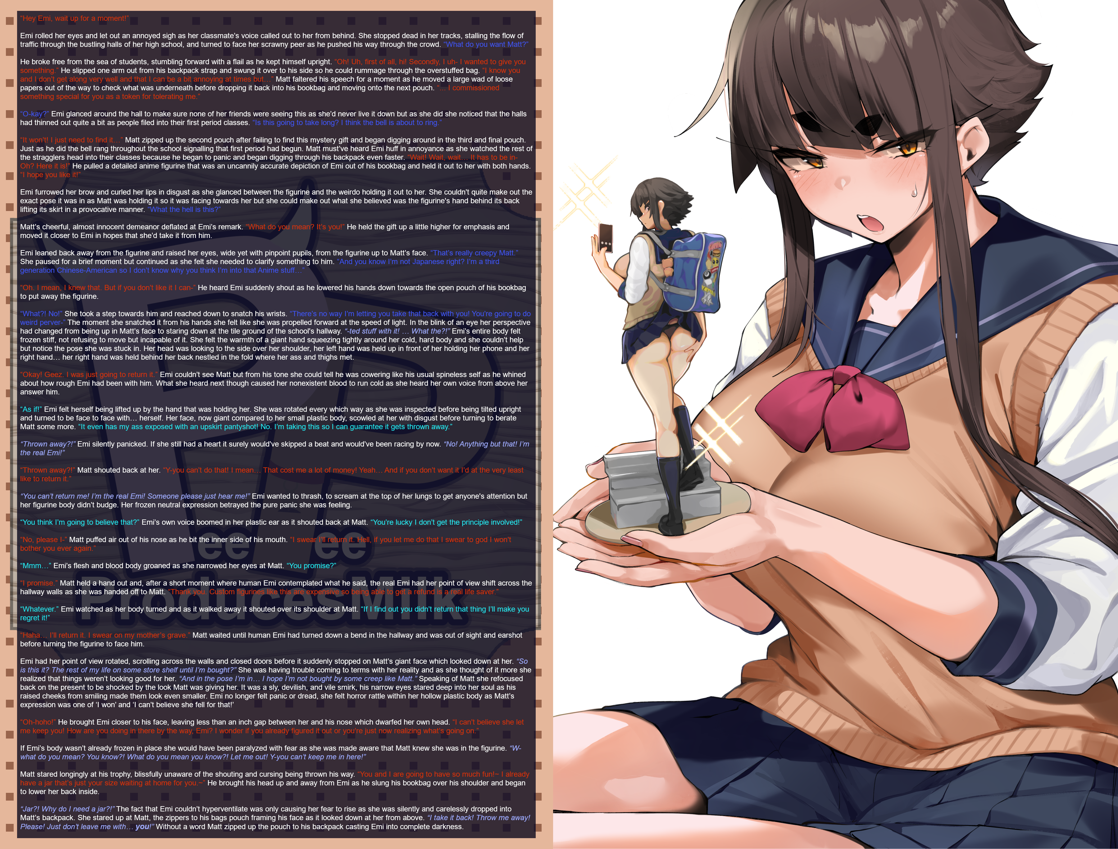 “What?! No!” She took a step towards him and reached down to snatch his wrists. “There’s no way I’m letting you take that back with you! You’re going to do weird perver-” The moment she snatched it from his hands she felt like she was propelled forward at the speed of light. In the blink of an eye her perspective had changed from being up in Matt’s face to staring down at the tile ground of the school's hallway. “-ted stuff with it! … What the?!” Emi’s entire body felt frozen stiff, not refusing to move but incapable of it. She felt the warmth of a giant hand squeezing tightly around her cold, hard body and she couldn’t help but notice the pose she was stuck in. Her head was looking to the side over her shoulder, her left hand was held up in front of her holding her phone and her right hand… her right hand was held behind her back nestled in the fold where her ass and thighs met.