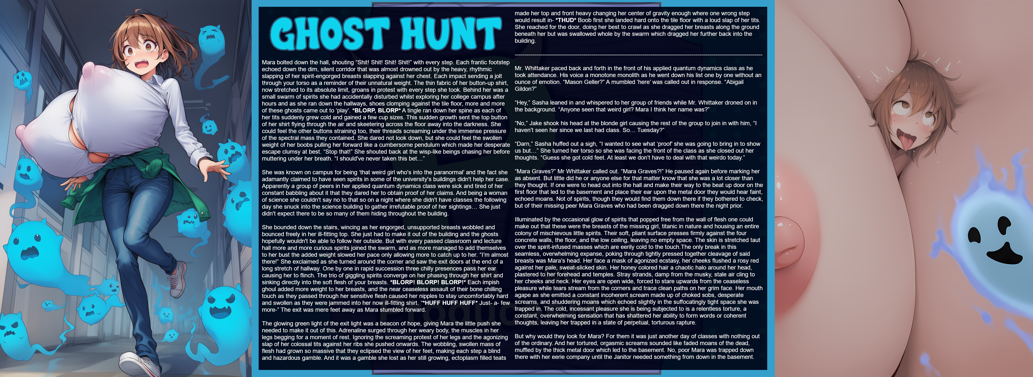Mara bolted down the hall, shouting “Shit! Shit! Shit! Shit!” with every step. Each frantic footstep echoed down the dim, silent corridor that was almost drowned out by the heavy, rhythmic slapping of her spirit-engorged breasts slapping against her chest. Each impact sending a jolt through your torso as a reminder of their unnatural weight. The thin fabric of her button-up shirt, now stretched to its absolute limit, groans in protest with every step she took. Behind her was a small swarm of spirits she had accidentally disturbed whilst exploring her college campus after hours and as she ran down the hallways, shoes clomping against the tile floor, more and more of these ghosts came out to ‘play’. BLORP, BLORP A tingle ran down her spine as each of her tits suddenly grew cold and gained a few cup sizes. This sudden growth sent the top button of her shirt flying through the air and skeetering across the floor away into the darkness. She could feel the other buttons straining too, their threads screaming under the immense pressure of the spectral mass they contained. She dared not look down, but she could feel the swollen weight of her boobs pulling her forward like a cumbersome pendulum which made her desperate escape clumsy at best. “Stop that!” She shouted back at the wisp-like beings chasing her before muttering under her breath. “I should've never taken this bet…”
